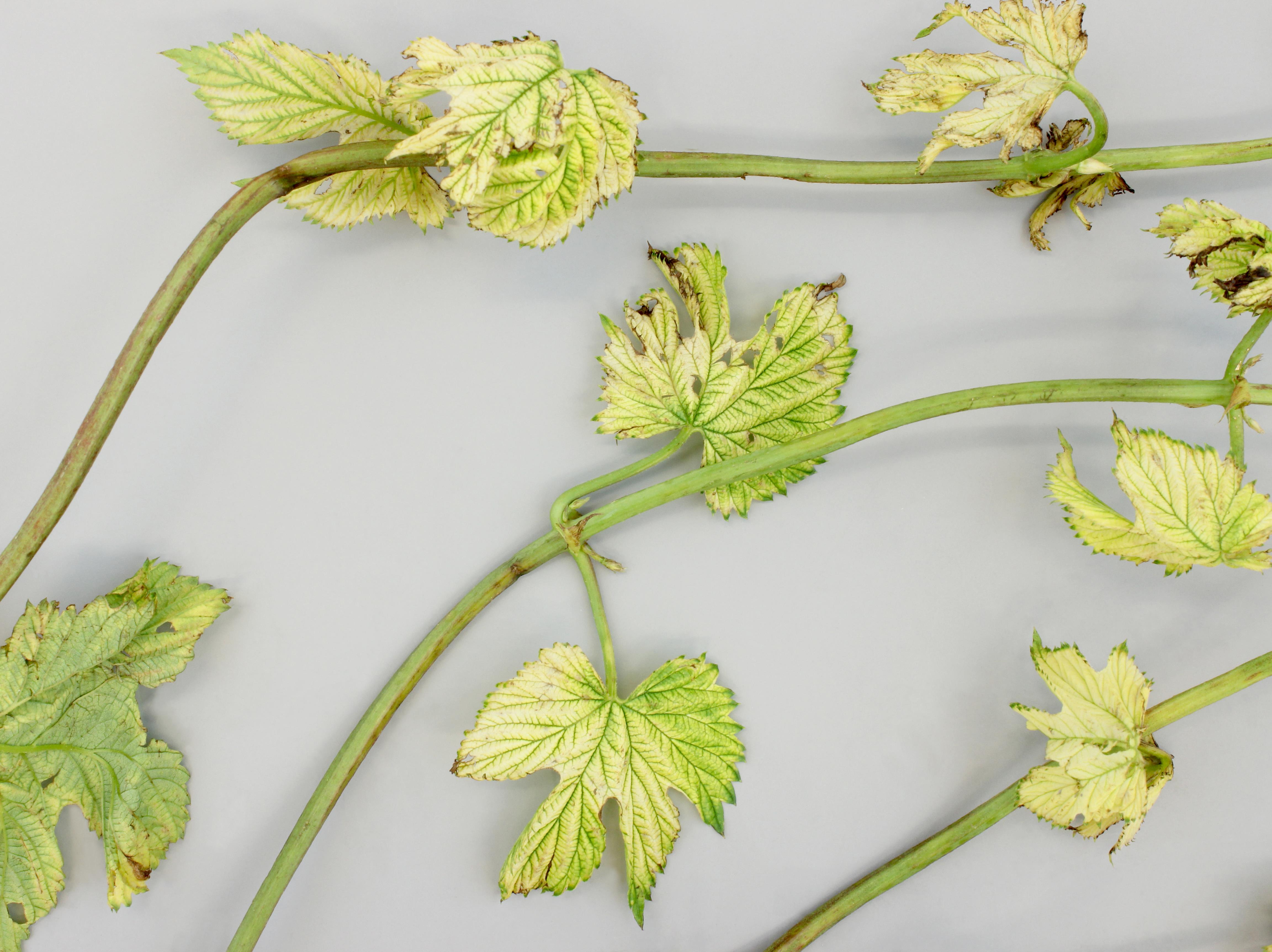 Une vue rapprochée des tiges feuillées de houblon montre un blanchiment à jaunissement du limbe entre les nervures qui demeurent vertes. Quelques brûlures foliaires sont observées. Les feuilles terminales sont les plus affectées. L’analyse chimique effectuée par le Laboratoire d'expertises et d'analyses alimentaires (LEAA) du MAPAQ a révélé la présence de l’herbicide glyphosate dans les tissus endommagés. Les symptômes observés sur le houblon sont très caractéristiques d'une phytotoxicité par le glyphosate.