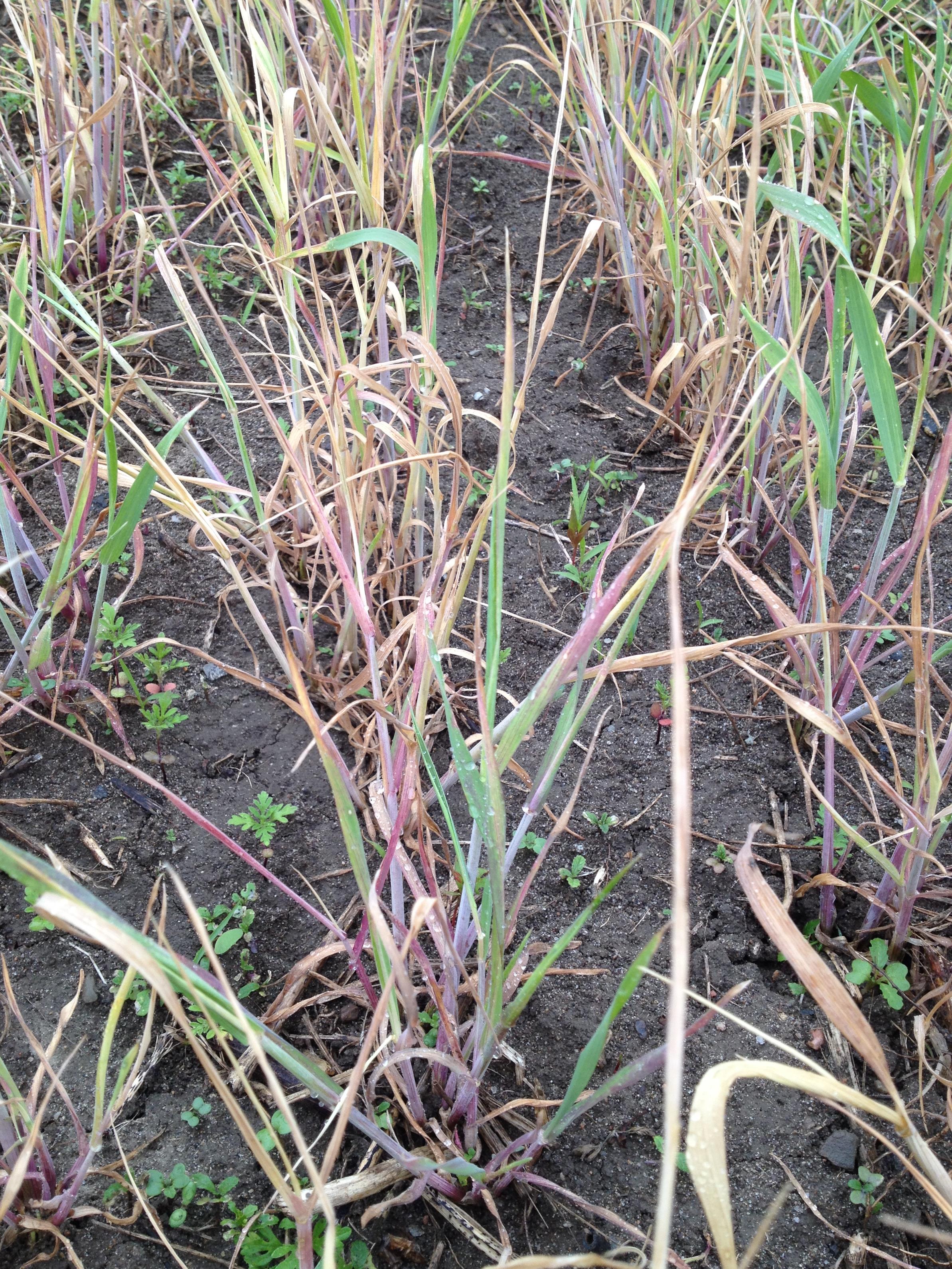 Des rangs dans un champ de seigle d'automne présentent des plants dont les feuilles sont brûlées avec souvent une coloration pourpre. Ces symptômes sont attribuables à une dérive de l'herbicide glyphosate, survenue dans ce champ, à l'automne précédent. Dans une telle situation, le rendement de la culture peut être affecté, selon le pourcentage de plants touchés.
