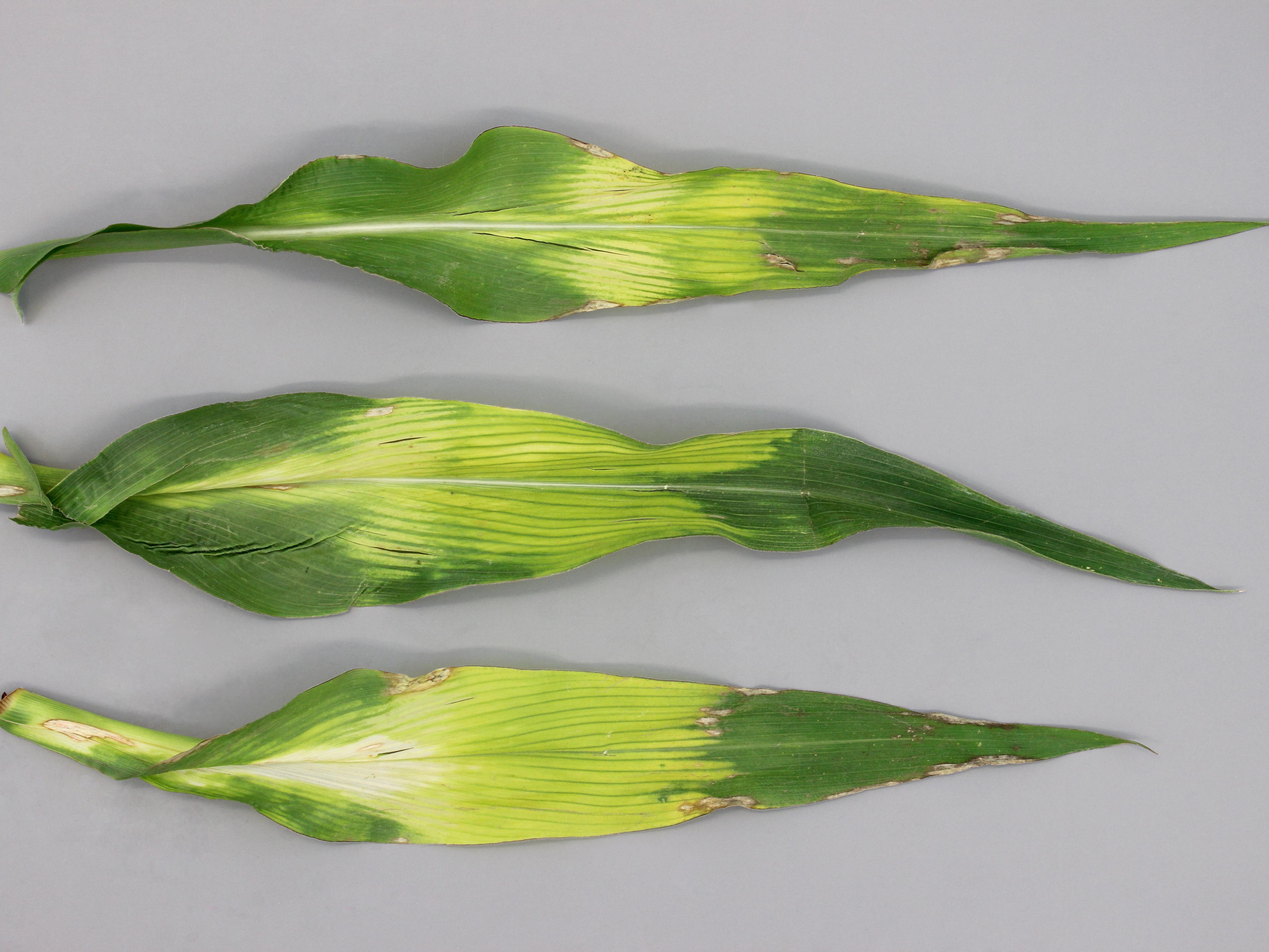 Des feuilles de maïs grain non tolérant (variété non tolérante) au glyphosate présentent un blanchiment entre les nervures, au point d’inflexion des feuilles. Les feuilles basales et médianes sont affectées. Ce symptôme est apparu graduellement sur les plants de maïs situés en bordure du champ, voisin d’un champ de soya, traité au glyphosate. Chez le maïs, la présence de bandes blanches (« banding pattern ») sur le limbe est caractéristique d’une phytotoxicité par le glyphosate. Le dosage chimique réalisé a permis de déceler la présence de glyphosate en grande concentration dans les feuilles.