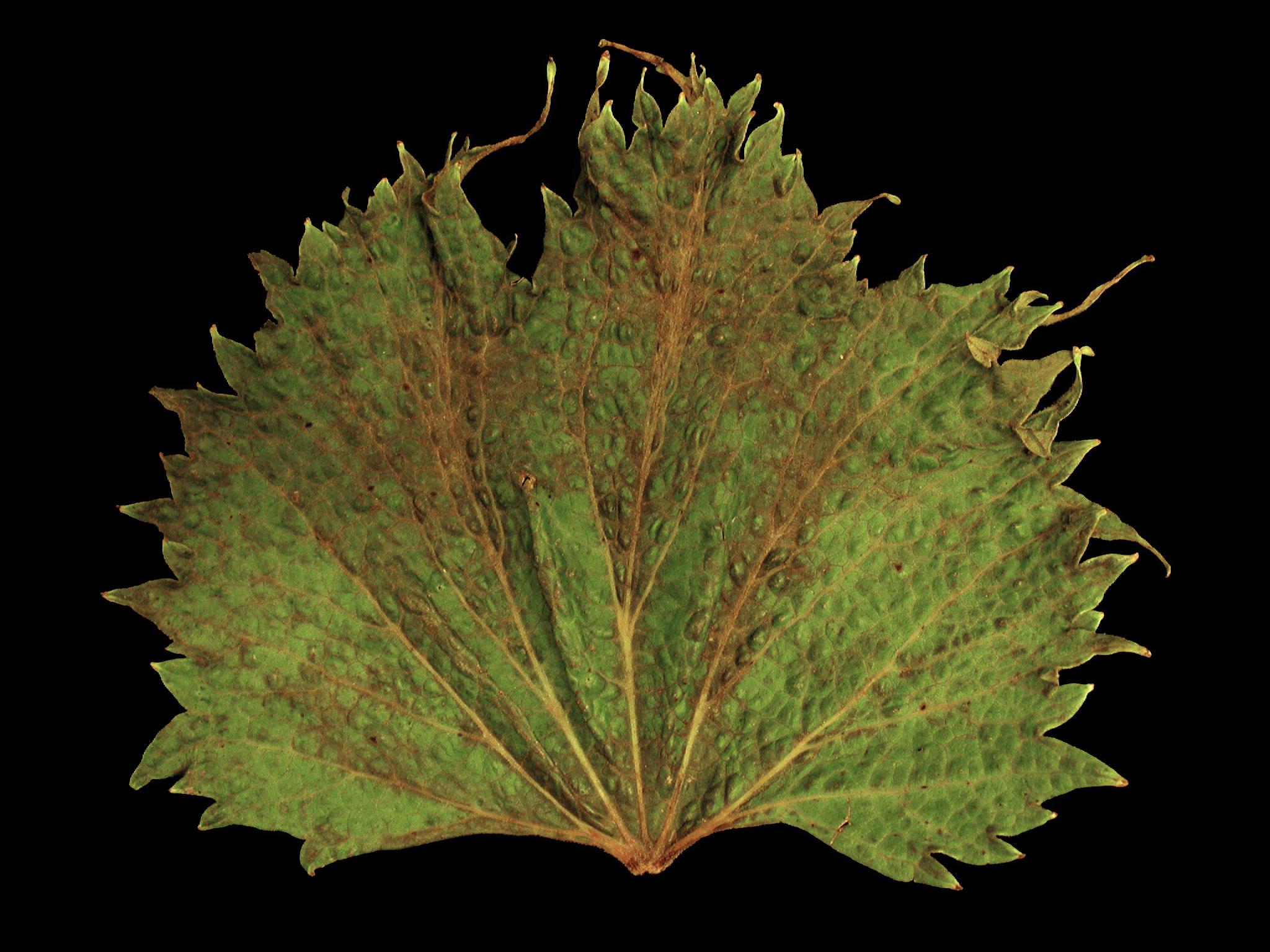 La face supérieure d’une feuille de vigne (cv 'Eona') montre une marge très découpée en forme de dents allongées avec des excroissances filiformes, du gaufrage et une surface du limbe bosselée ainsi que des nervures saillantes et parallèles. Les jeunes feuilles sont les plus affectées. Ces malformations sont typiques d'une phytotoxicité par des herbicides du groupe 4 (phytohormones ou auxines). Malheureusement, l’herbicide responsable des dommages n’a pu être précisé.
