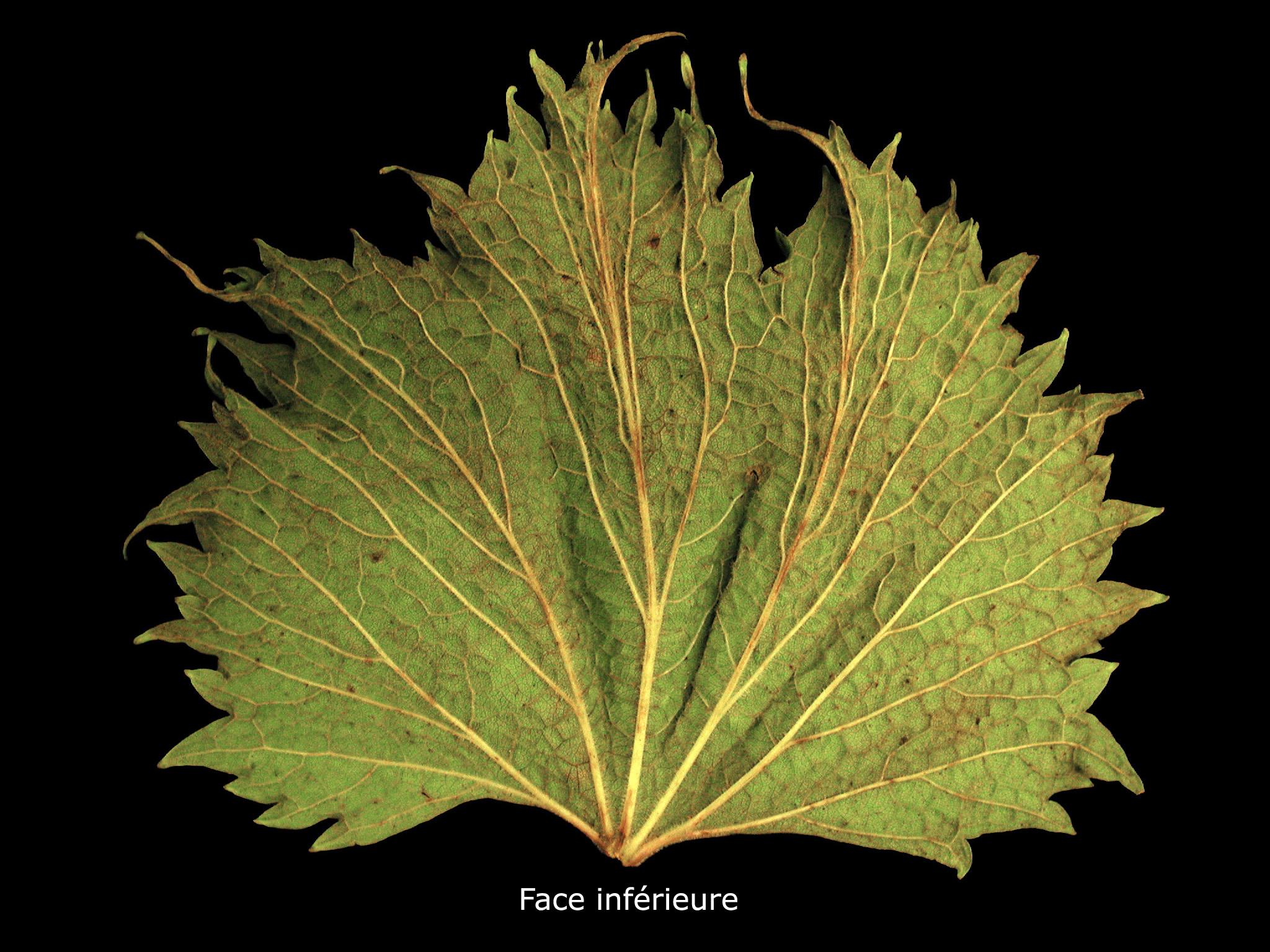 La face inférieure d’une feuille de vigne (cv 'Eona') montre une marge très découpée en forme de dents allongées avec des excroissances filiformes et des nervures saillantes et parallèles. Les jeunes feuilles sont les plus affectées. Ces malformations sont typiques d'une phytotoxicité par des herbicides du groupe 4 (phytohormones ou auxines). Malheureusement, l’herbicide responsable des dommages n’a pu être précisé.
