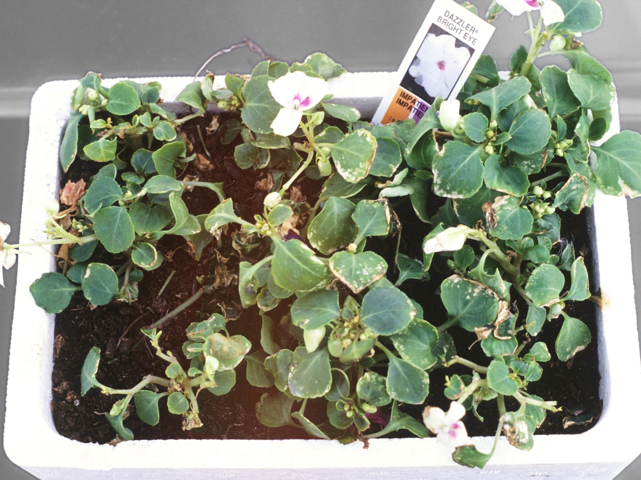 De jeunes plants d’impatientes montrent des taches blanches débutant à la marge des feuilles et progressant entre les nervures. Certaines feuilles ont une marge brûlée et courbée vers le haut. Ces symptômes sont apparus à la suite d’un traitement fait avec un adjuvant ajouté à l’eau d’arrosage. Le producteur voulait uniformiser le degré d'humidité du substrat de ses caissettes d’annuelles, car certaines caissettes étaient très sèches alors que d’autres étaient trop humides. Malheureusement, il a mis une trop forte dose de l’agent mouillant dans son eau d'arrosage.