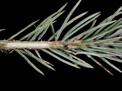 Le système vasculaire d’un rameau d’épinette du Colorado (cv 'Neon blue') est sans symptôme. Des taches brunes et un brunissement sont observés sur le dessus et à l’extrémité des aiguilles, mais seulement les aiguilles situées sur le dessus de ce rameau sont affectées. Toutes les autres aiguilles sont sans symptôme. Les observations microscopiques n’ont pas révélé la présence d’agent pathogène dans les aiguilles ni dans les rameaux. Par contre, des microlésions non évolutives ont été observées sur les aiguilles.