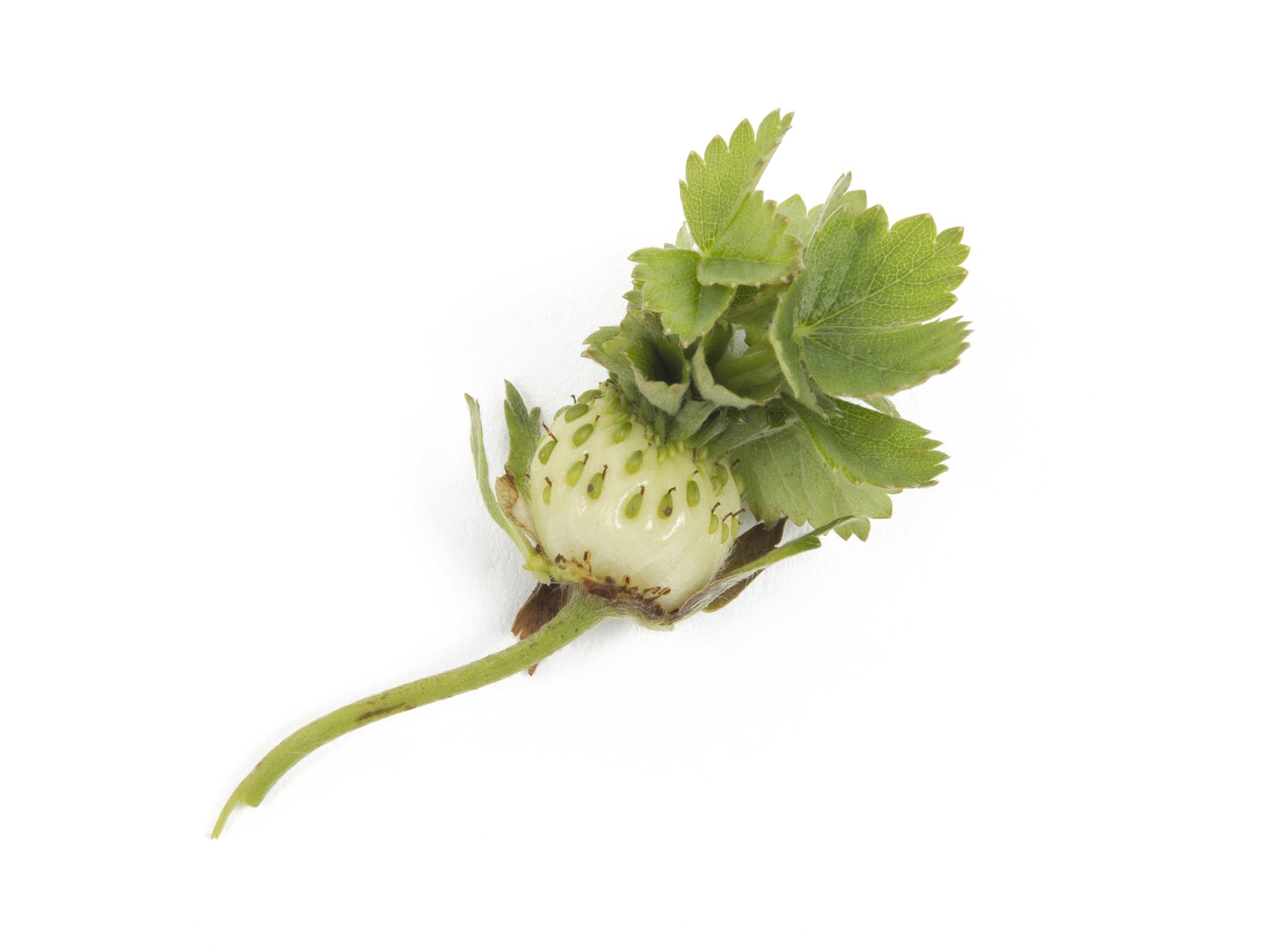 Sur ces fraises (cv 'Malwina'), on observe une croissance foliacée à partir des akènes du fruit. Puisqu’aucun phytoplasme n’a été détecté, il est fort probable qu’il s’agisse de phyllodie non parasitaire.