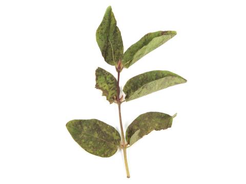 Les feuilles sur la tige d’un plant de camérisier montrent des taches sans halo (brûlures de contact), distribuées aléatoirement sur les feuilles et visibles sur la face inférieure. Elles sont diffuses à certains endroits et plus prononcées à d'autres. Ce symptôme a été causé par l’application de bromoxynil à proximité des camérisiers (dérive de produit). Cet herbicide de contact est entre autres utilisé pour éliminer les feuilles larges dans les céréales et le maïs et n'est pas homologué pour la culture des petits fruits, dont celle de la camerise. Le dosage chimique réalisé a montré la présence de l’herbicide à une faible concentration, toutefois suffisante pour causer des dommages. La brûlure évolue en nécrose sur les tissus atteints mais les nouvelles feuilles ne sont pas affectées. L'herbicide ne migre pas dans la plante; les brûlures n’apparaissent que sur les parties touchées.