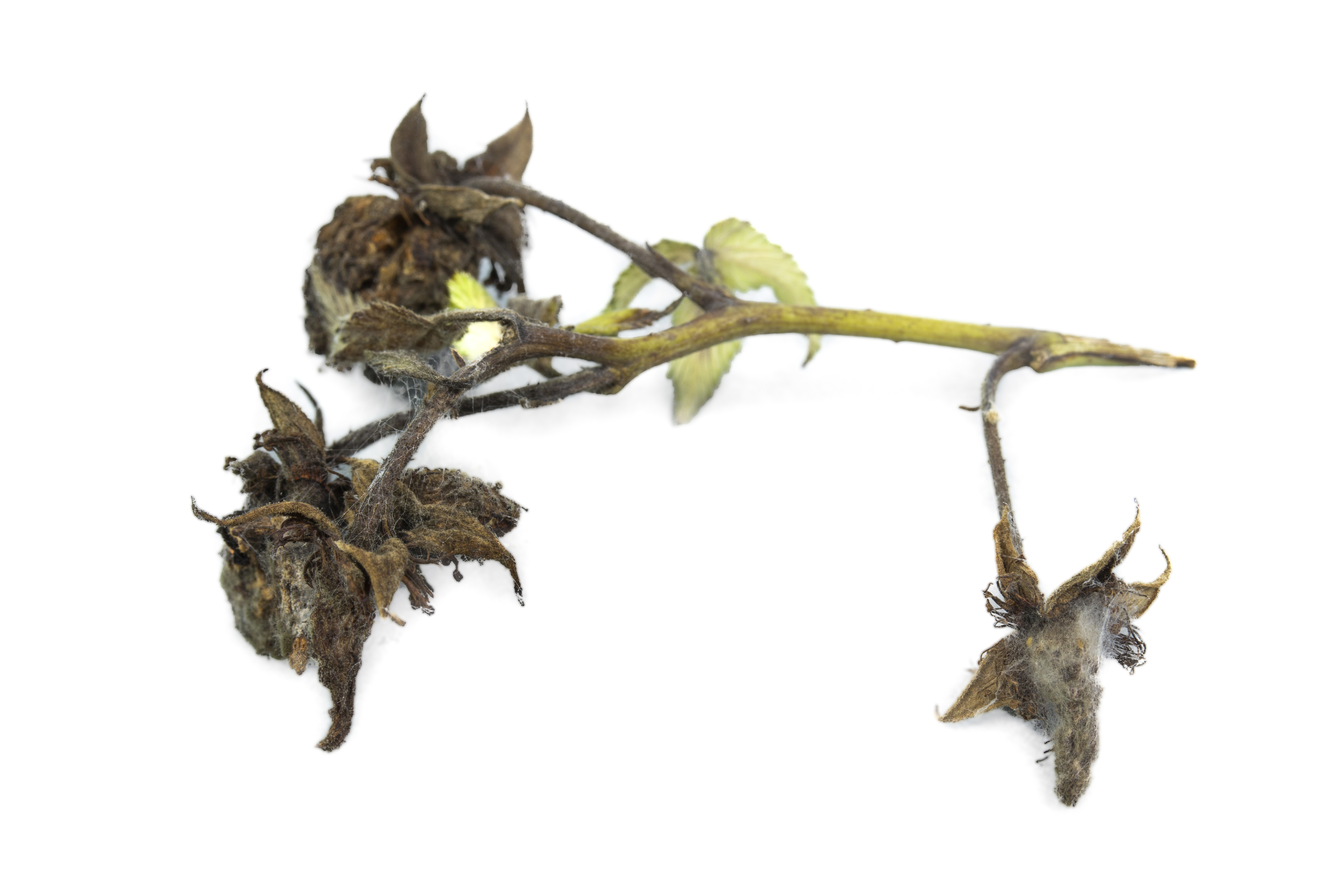 Sur cette grappe de framboisier (cv 'Patriot'), les fruits sont complètement brunis et momifiés. Les sépales et les pédicelles sont brunis et desséchés et l’on observe une sporulation noire sur les tissus. Un mycélium blanc a proliféré sur l’ensemble des tissus atteints.Les tests en laboratoire ont permis d’identifier la présence de Botrytis sp., responsable de la moisissure grise chez la framboise.