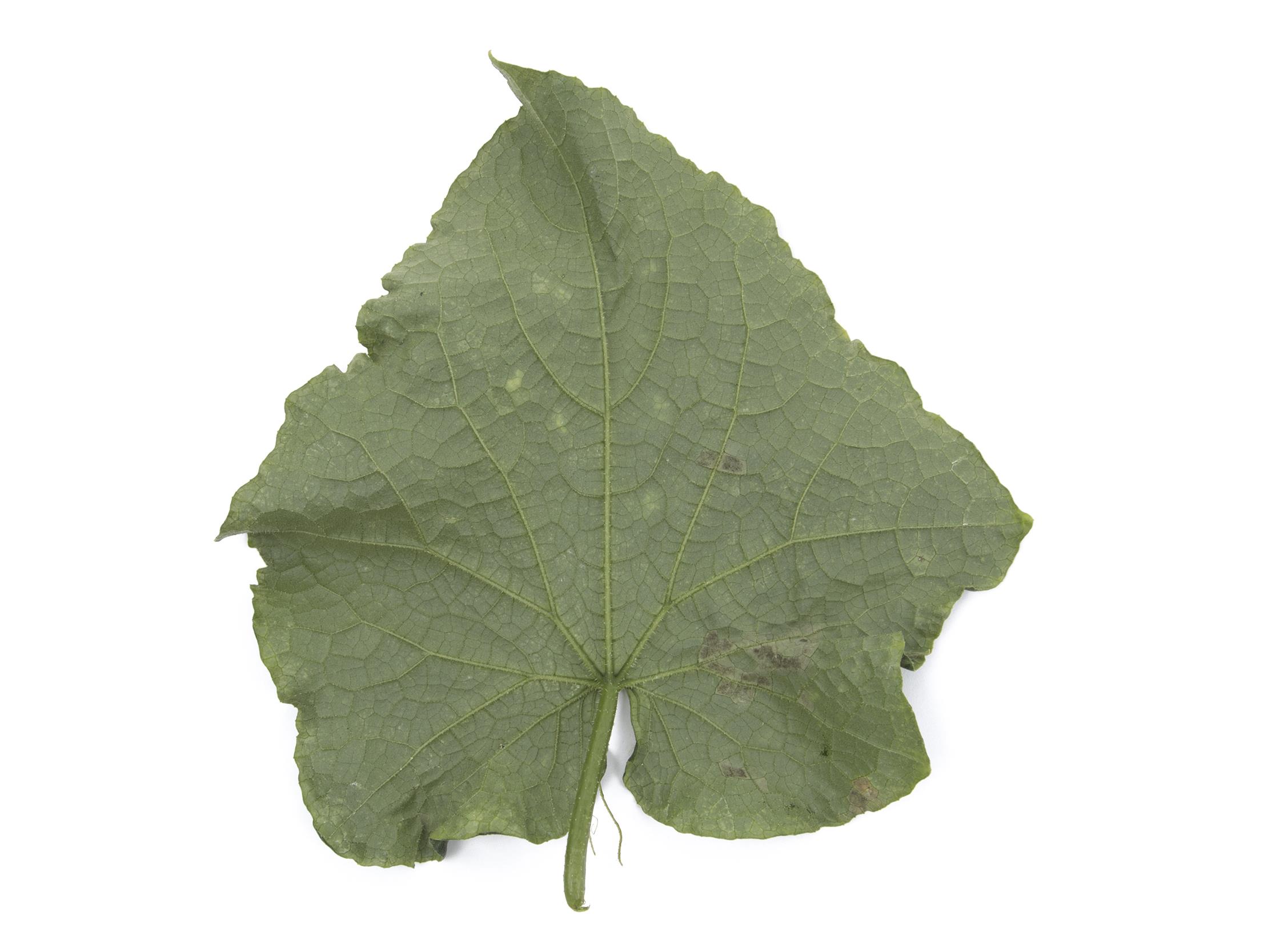Symptôme du mildiou causé par Pseudoperonospora cubensis sur la face inférieure d'une feuille de concombre.