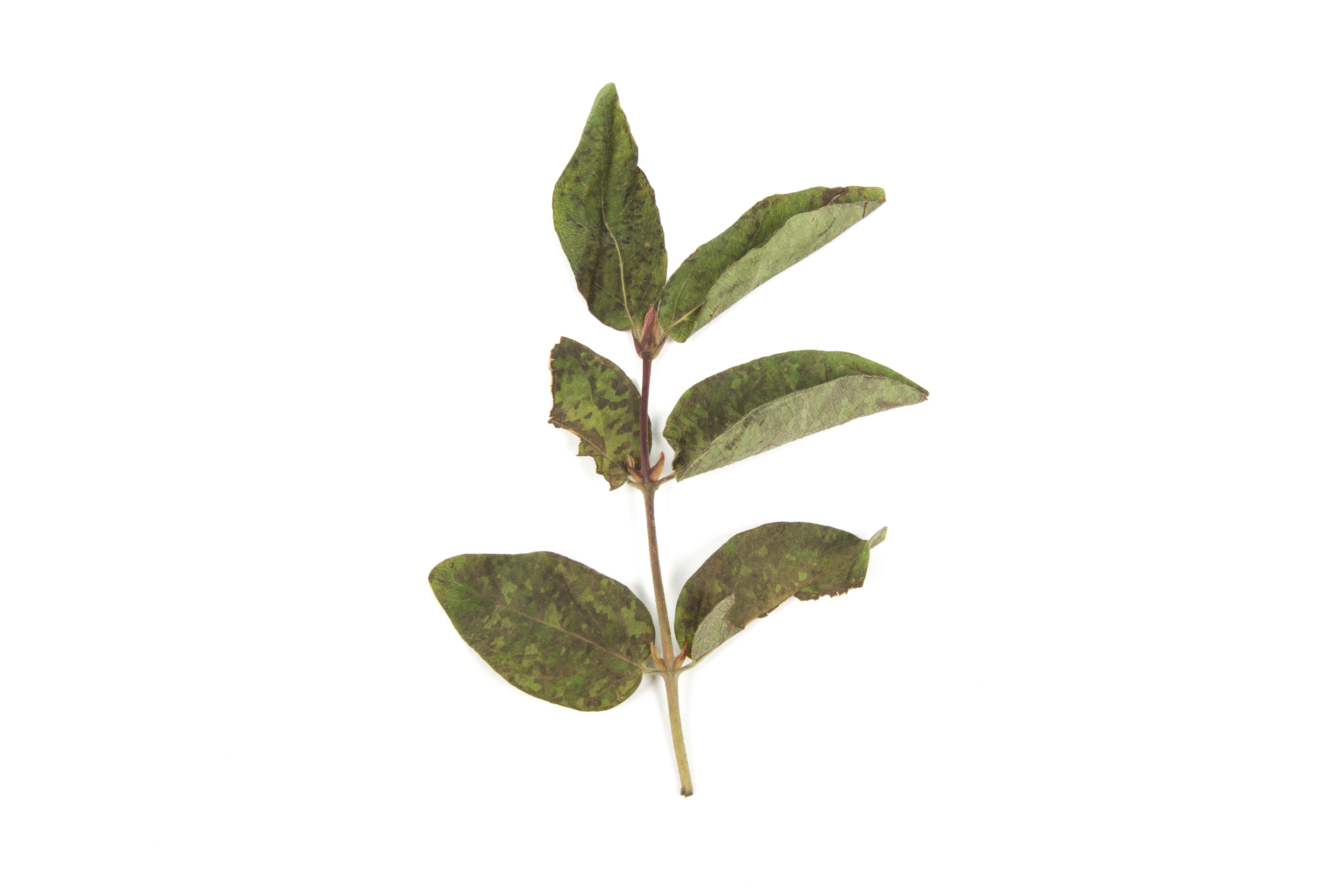 Les feuilles sur la tige d’un plant de camérisier montrent des taches sans halo (brûlures de contact), distribuées aléatoirement sur les feuilles et visibles sur la face inférieure. Elles sont diffuses à certains endroits et plus prononcées à d'autres. Ce symptôme a été causé par l’application de bromoxynil à proximité des camérisiers (dérive de produit). Cet herbicide de contact est entre autres utilisé pour éliminer les feuilles larges dans les céréales et le maïs et n'est pas homologué pour la culture des petits fruits, dont celle de la camerise. Le dosage chimique réalisé a montré la présence de l’herbicide à une faible concentration, toutefois suffisante pour causer des dommages. La brûlure évolue en nécrose sur les tissus atteints mais les nouvelles feuilles ne sont pas affectées. L'herbicide ne migre pas dans la plante; les brûlures n’apparaissent que sur les parties touchées.
