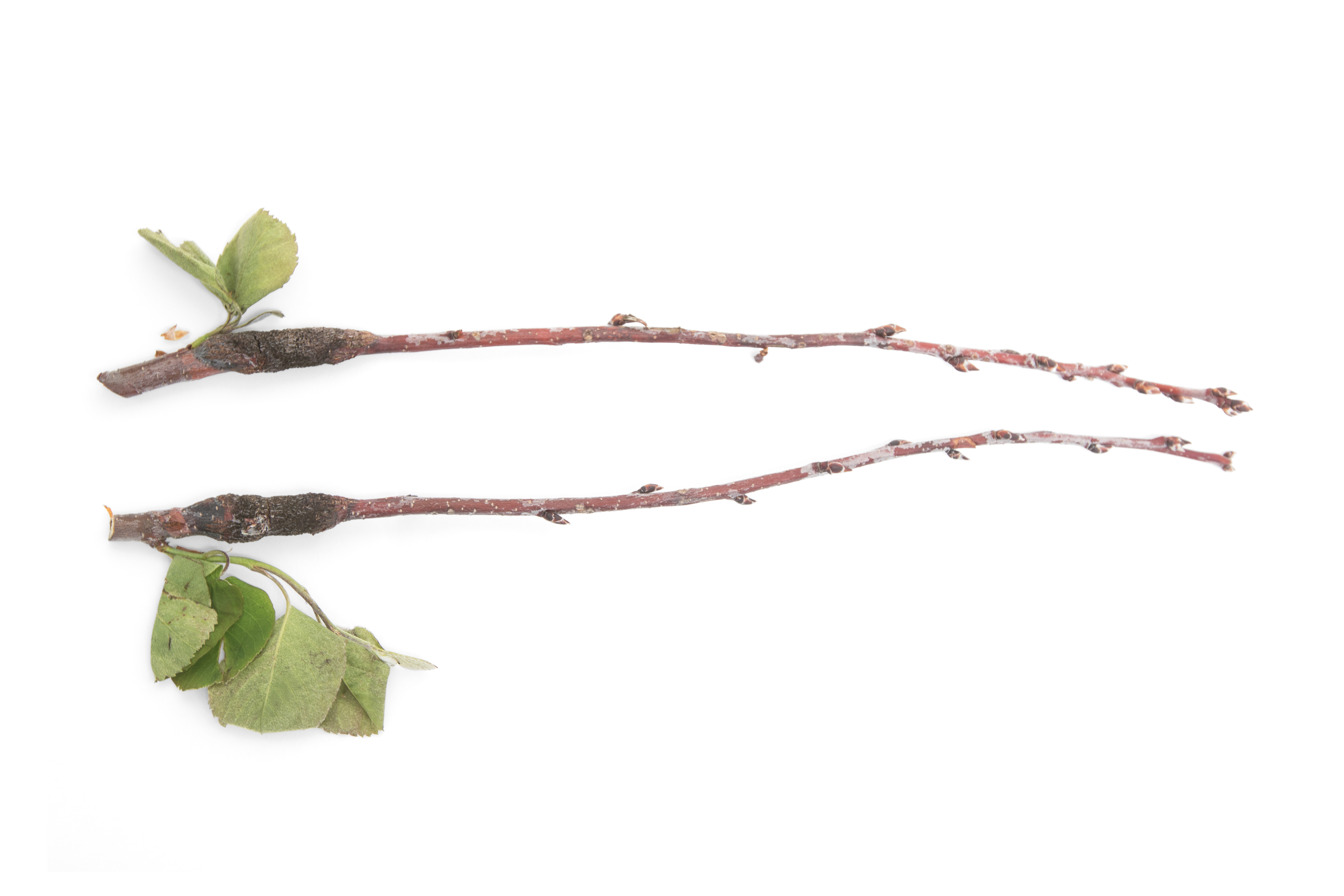 Sur des rameaux d'amélanchiers, présence de chancres secs, renflés, noirs et crevassés. Les chancres mesurent environ 5 cm de longueur par 2 cm de diamètre. Aucune structure fongique n'a été observée au microscopique. L'allure et la grosseur des chancres nous indiquent qu'il s'agit probablement de lésions causées par une infection qui a eu lieu il y a plus d'un an.