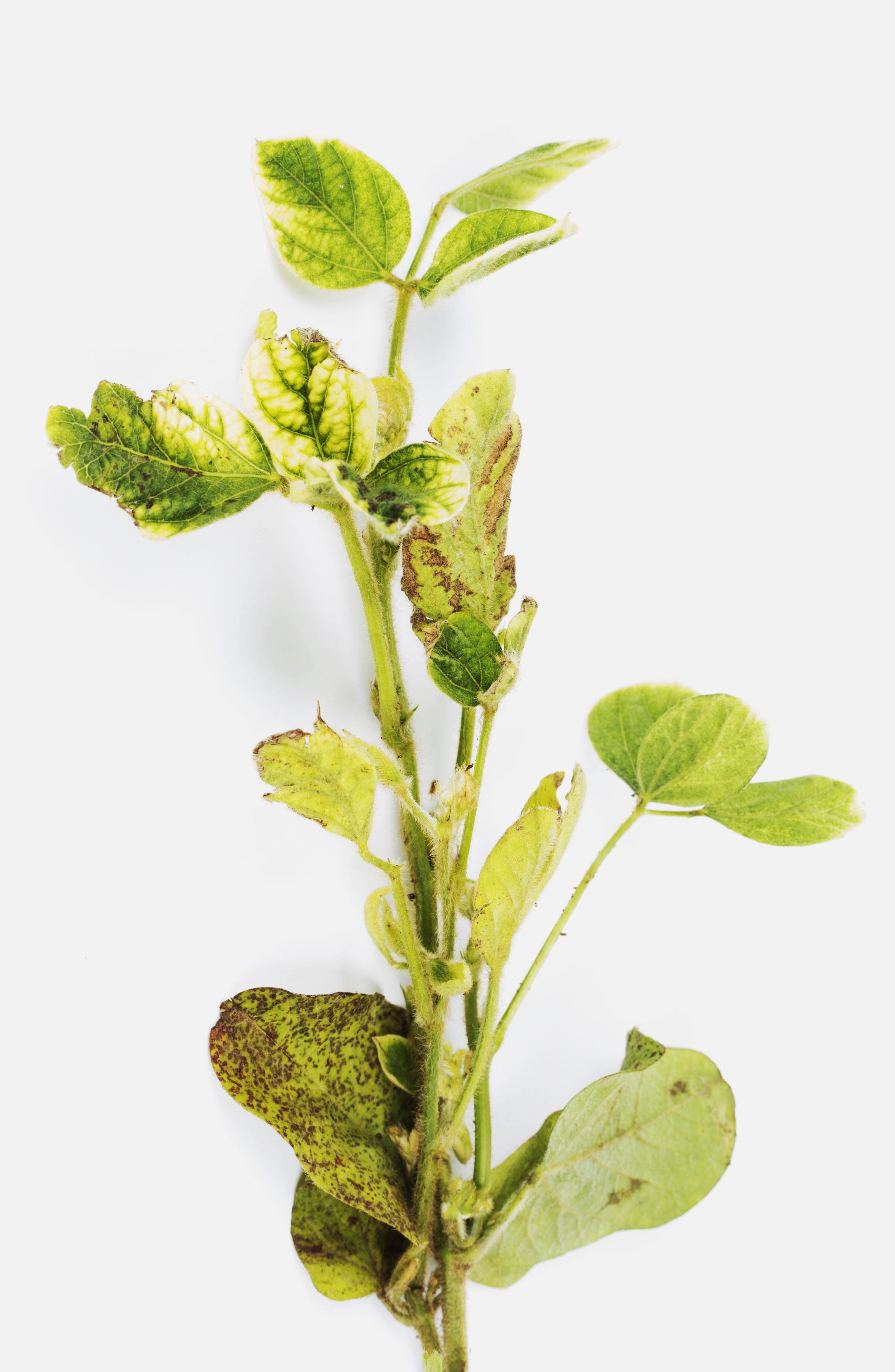 Les feuilles d'un plant de soya, non tolérant au glyphosate, présentent un jaunissement à blanchiment entre les nervures et à la pointe du limbe, accompagné de brûlures de taille réduite et éparses. Une déformation du limbe avec un aspect gaufré de l’épiderme, parfois accompagnés de nervures parallèles à la nervure principale (non visible ici), ainsi qu'un faible développement du plant ont aussi été observés. Le dosage chimique a révélé une concentration très élevée de glyphosate dans les tissus, supérieure à celle normalement retrouvée dans un plant suite à une application, ainsi que de son métabolite de dégradation (AMPA). Une très faible quantité d’atrazine et de son métabolite de dégradation (deséthyl-atrazine) ont aussi été retrouvés. Fusarium sp. (Michrodochium bolleiyi) a aussi été détecté mais ce champignon, endophyte des racines, n’est pas à l'origine des dommages observés sur les plants. Une erreur dans le choix de l'herbicide (et de dosage) aurait provoqué les symptômes de phytotoxicité, observés à la grandeur du champ.