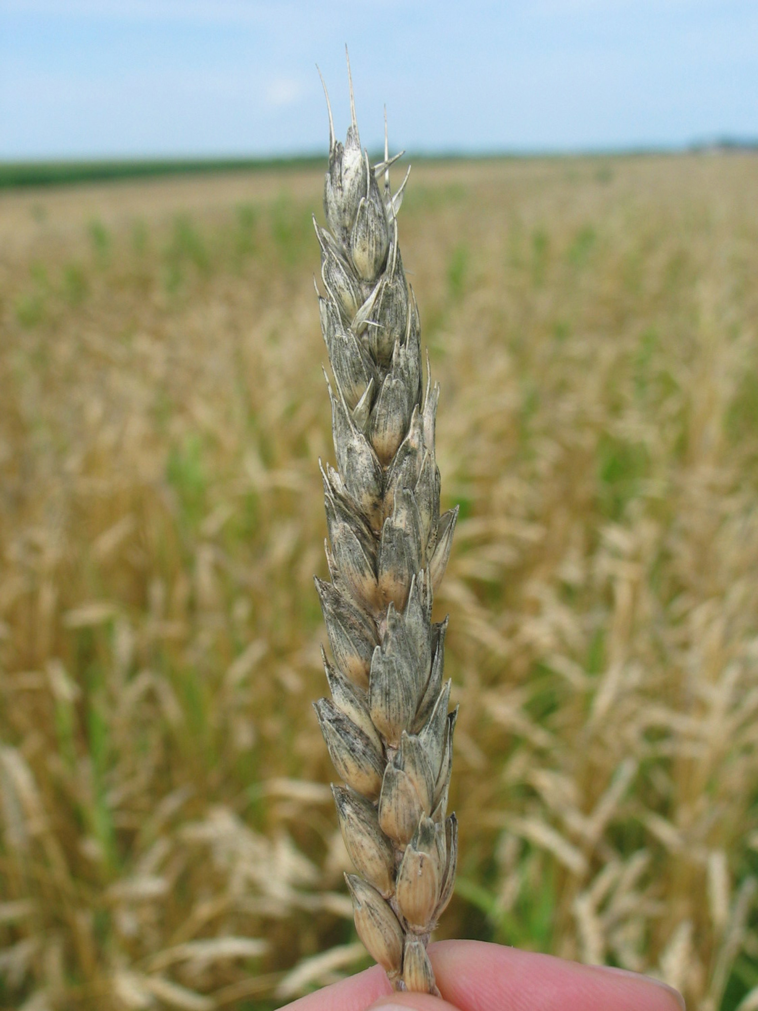 Un épi de blé de printemps est composé d’épillets noirs. Cette coloration noire est caractéristique de la fumagine ou noir des céréales. Elle est causée par divers champignons saprophytes.