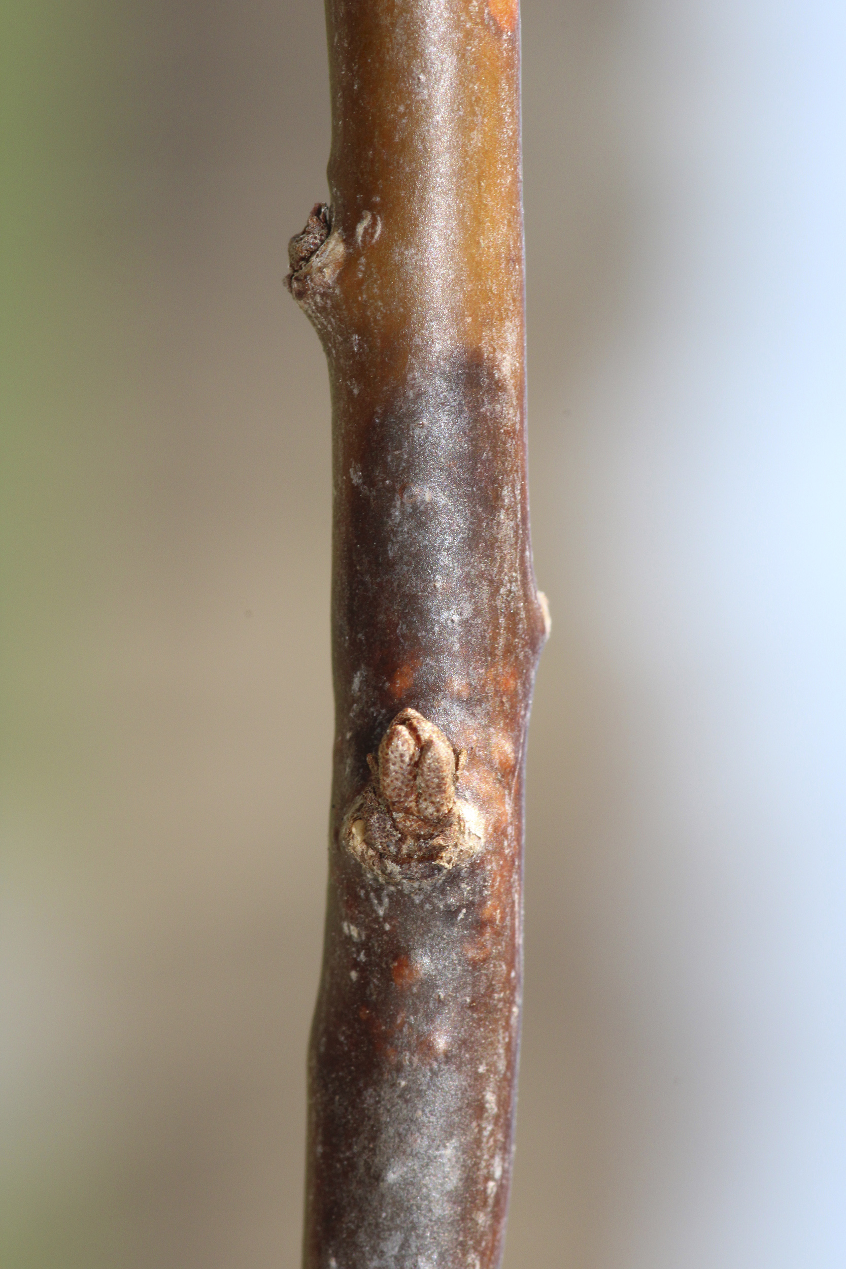 Décoloration de l’écorce d’une tige d’argousier due à une nouvelle infection de brûlure phomopsienne. Un chancre est en train de se développer.