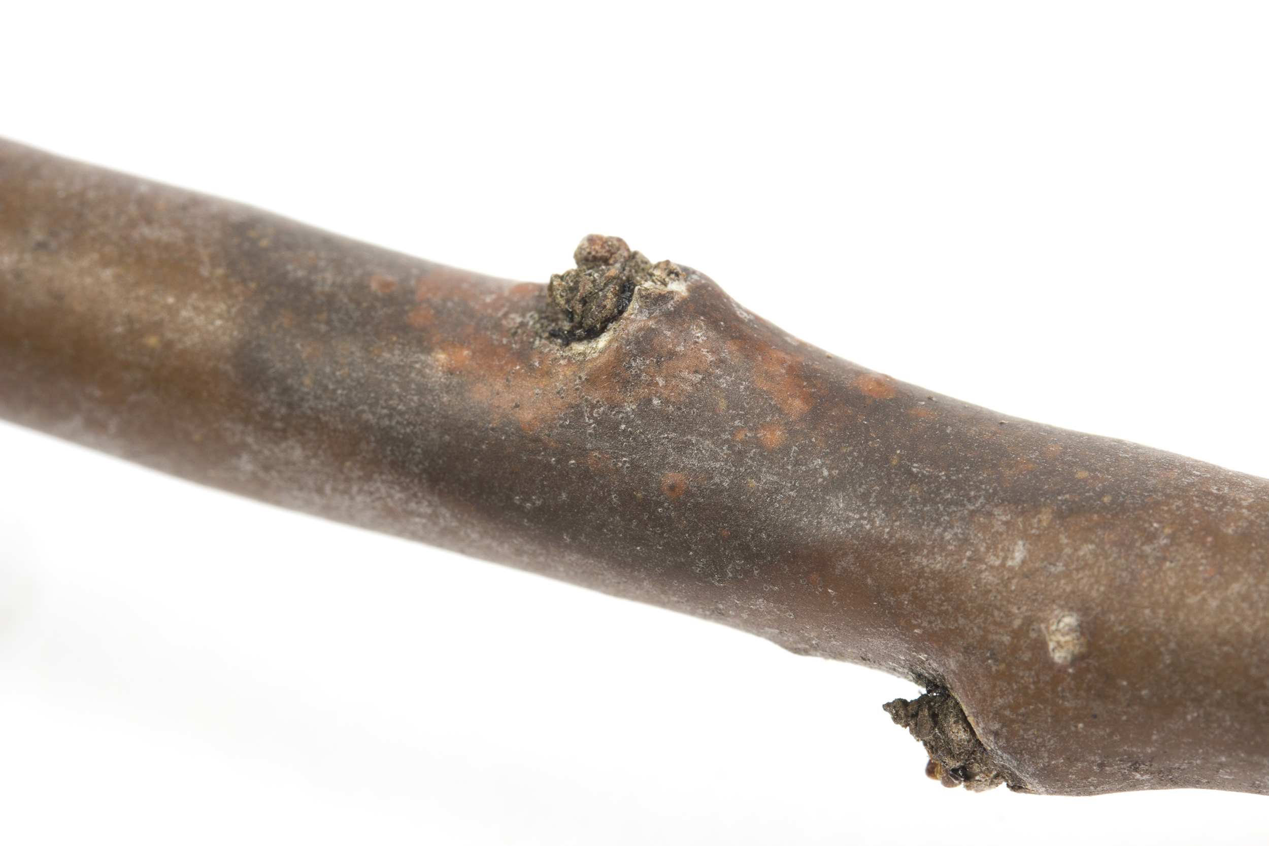 Cette tige d'argousier est infectée par Phomopsis sp., responsable de la brûlure phomopsienne. Le champignon semble avoir pénétré par la cicatrice foliaire. Le symptôme a été dépisté au mois de mai, sur un jeune plant peu vigoureux. La zone affectée est circulaire et violacées. Le bourgeon est mort.