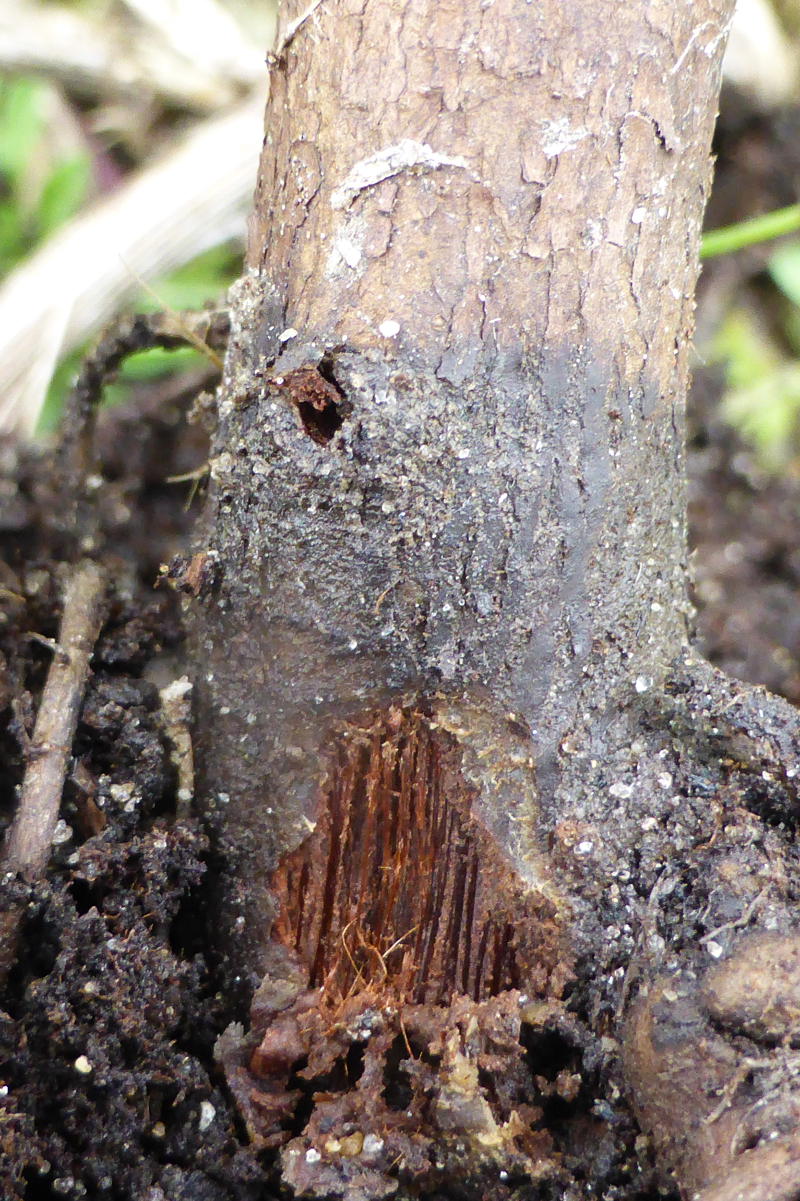 Chancre noir et visqueux au niveau du collet d’un jeune plant d’argousier.