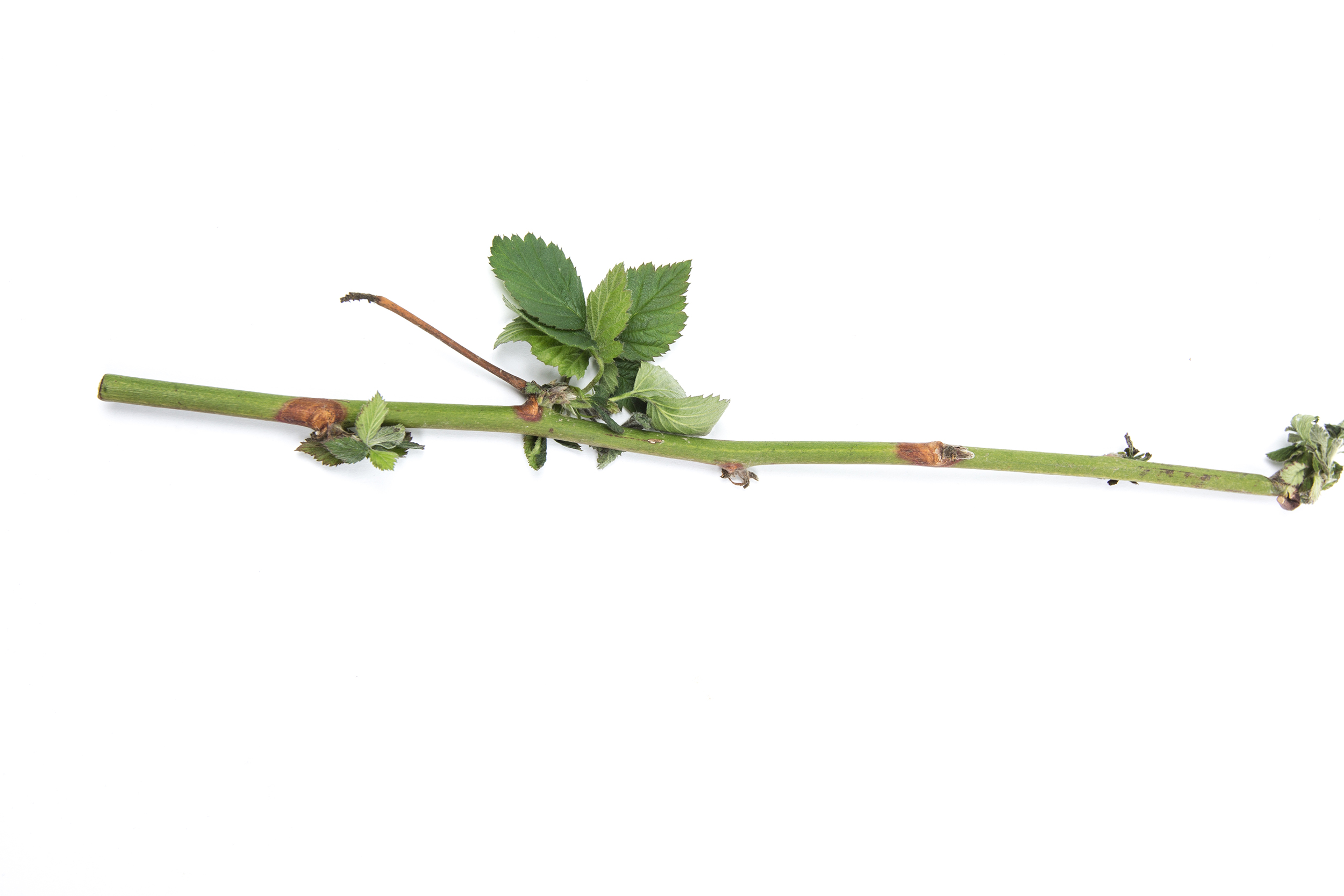 Lésions ovales et allongées autour des nœuds d’une tige de mûrier.