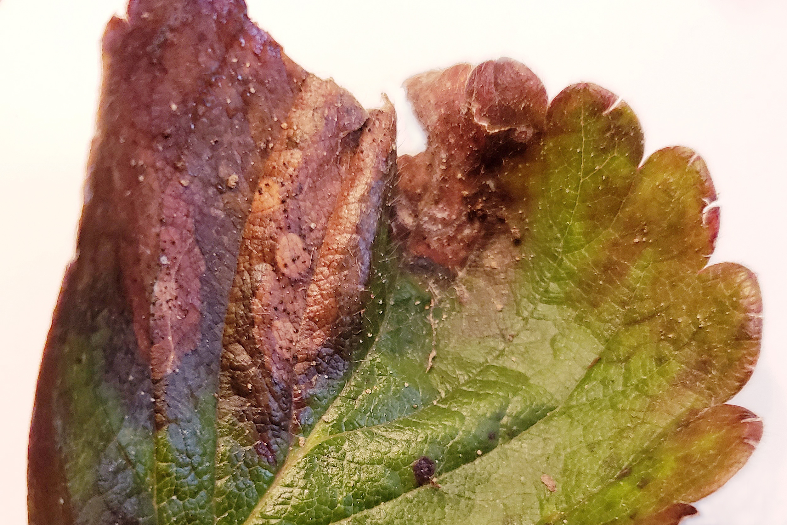 Brulûre des folioles et présence de pycnides (structures fongiques) causées par Neopestalotiopsis spp.