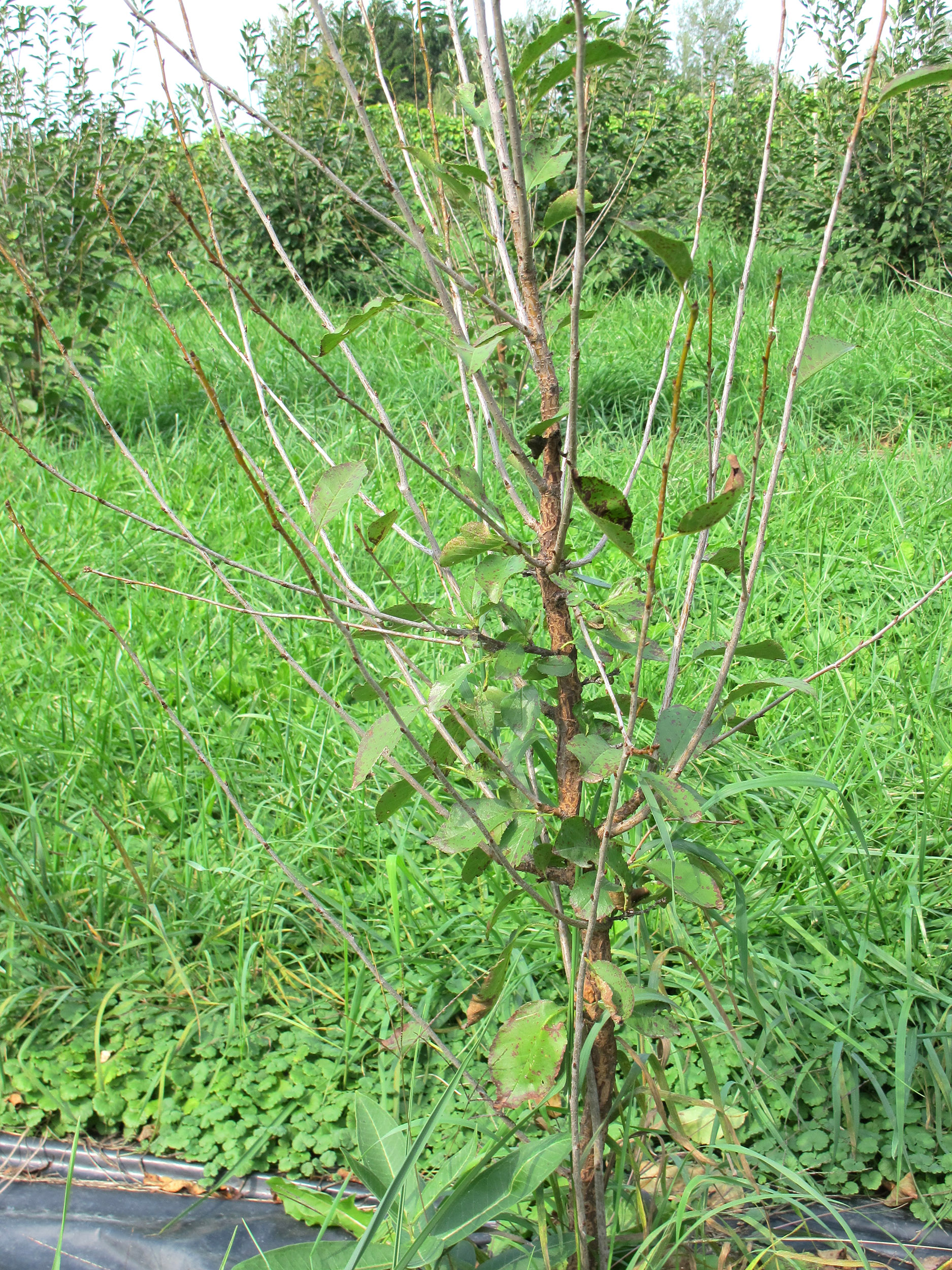 Défoliation hâtive d’un jeune plant de cerisier nain rustique Romeo en septembre.