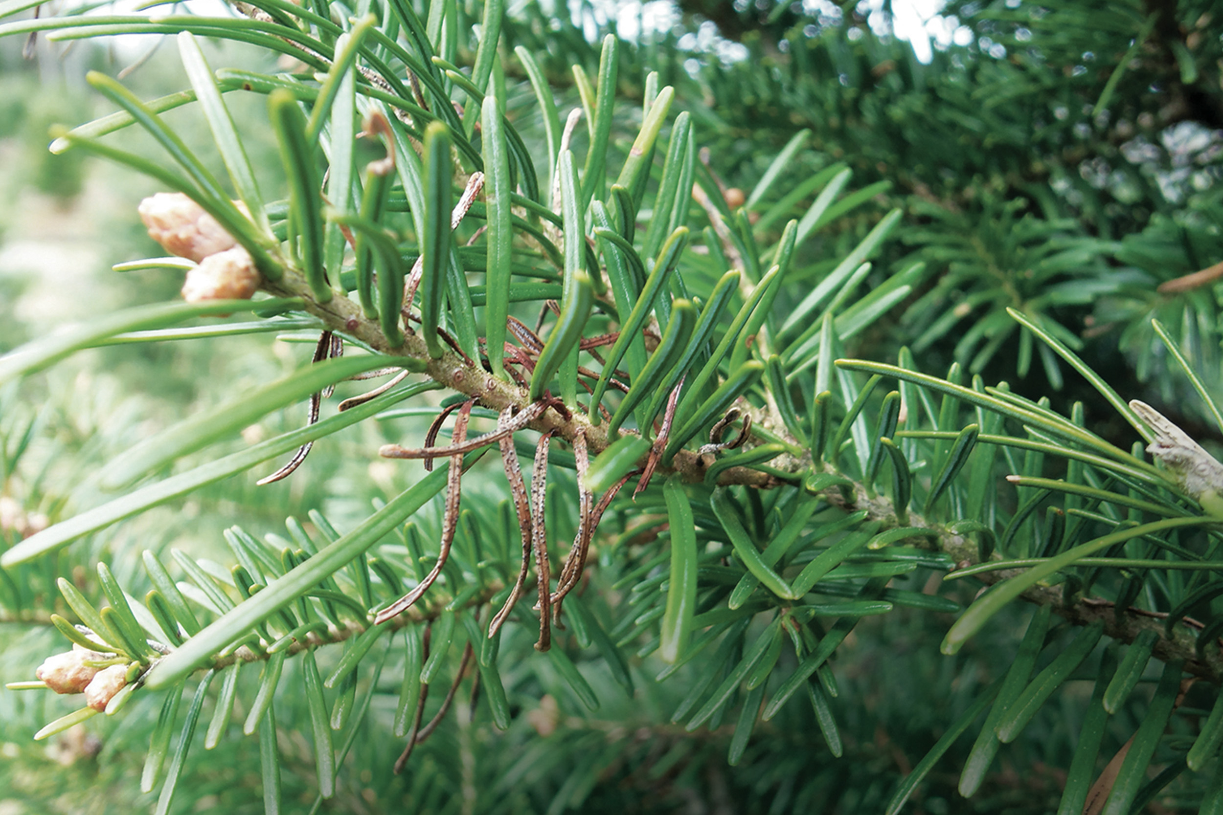 Symptômes à l'automne. On observe la présence de périthèces de Delphinella sp. sur les aiguilles brûlées.