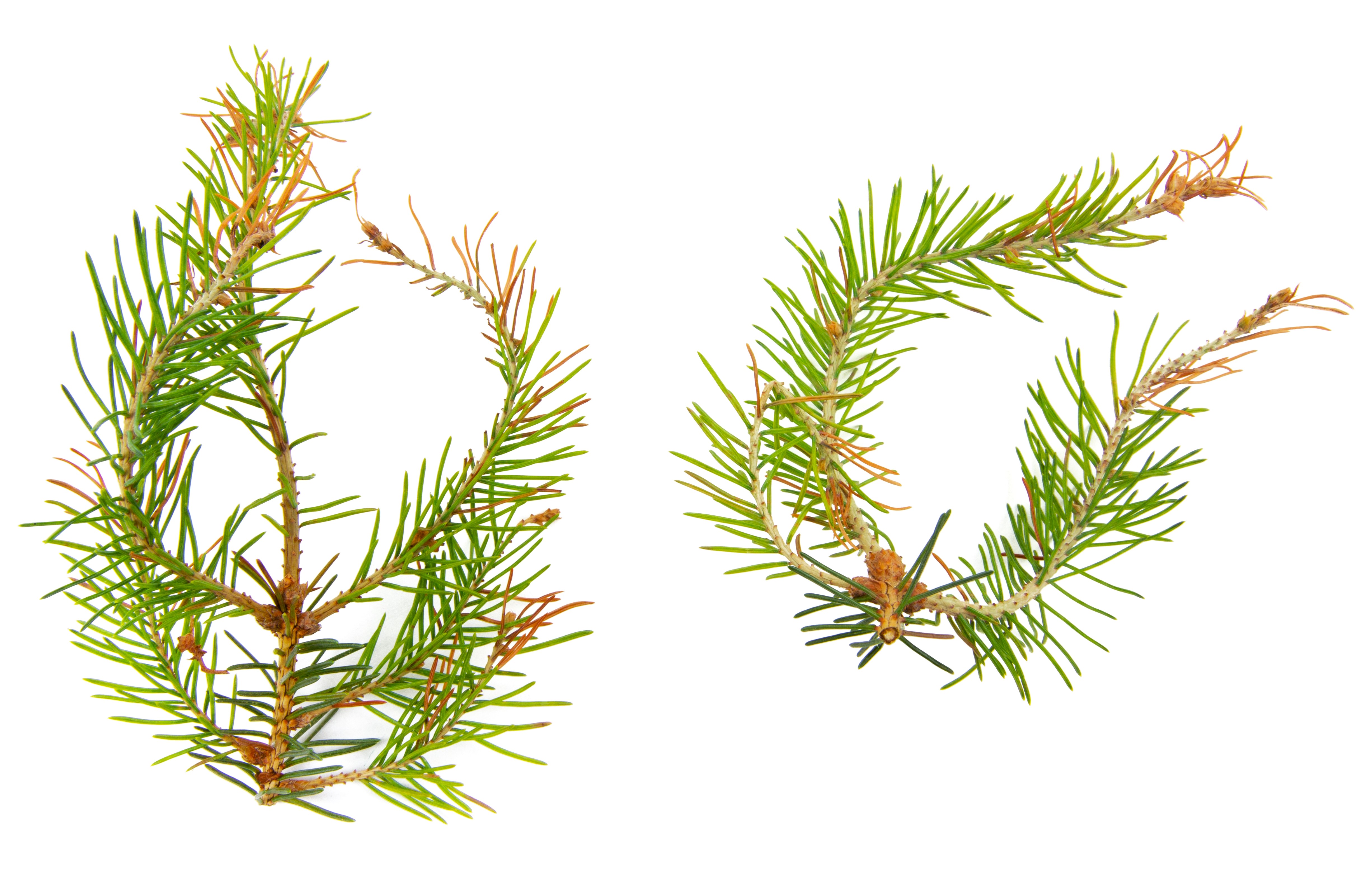 Tiges et aiguilles d’épinette jaunies ou brulées et déformées