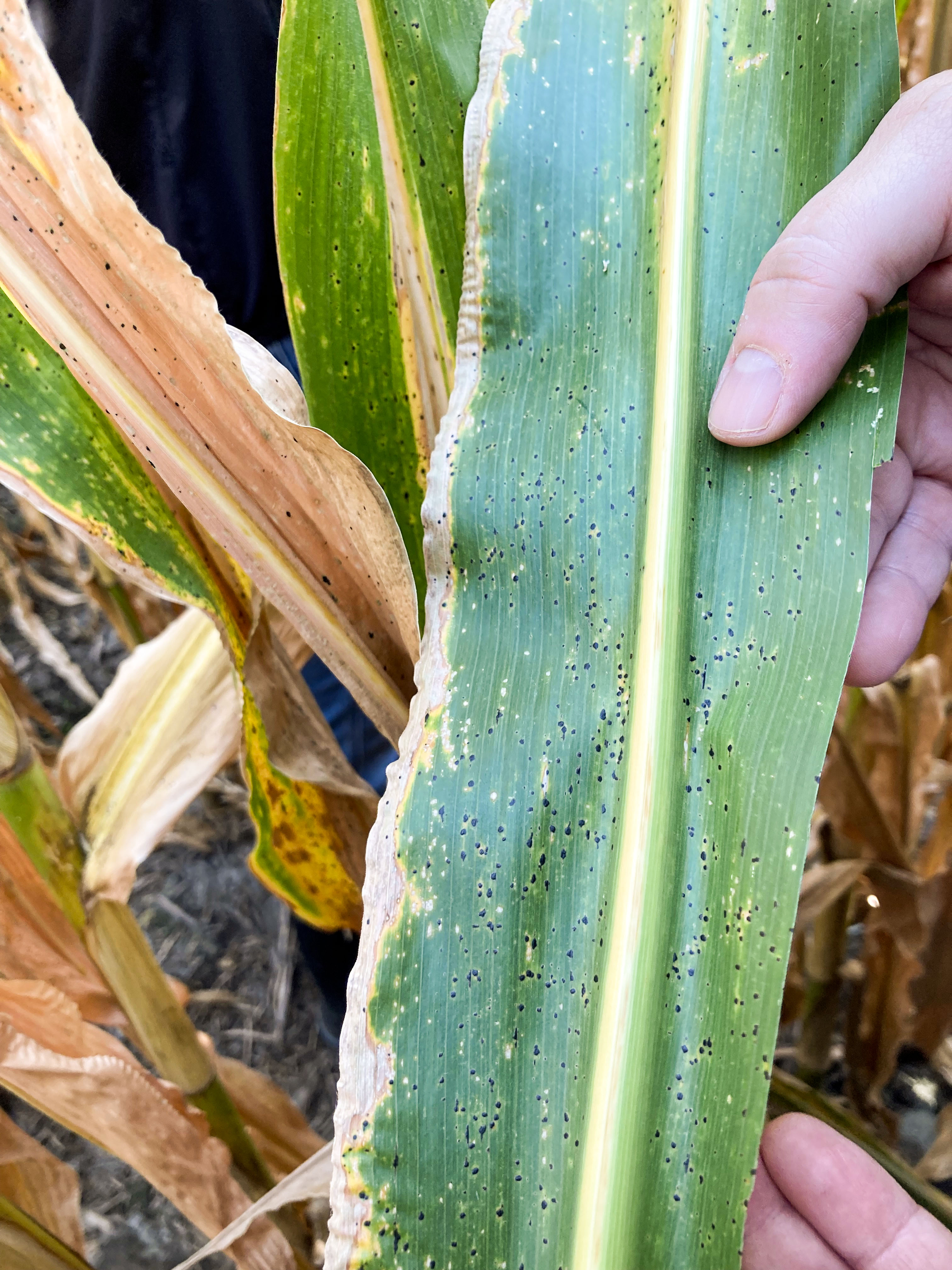 Symptôme de la tache goudronneuse sur une feuille de maïs.
