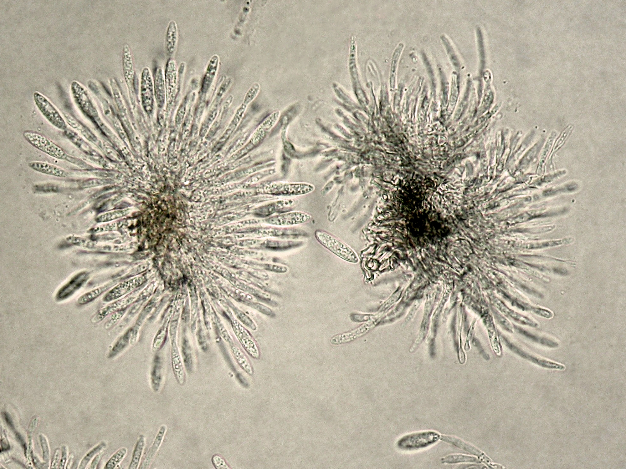 Deux acervules de Colletotrichum acutatum. Conidiophiores qui portent les conidies.