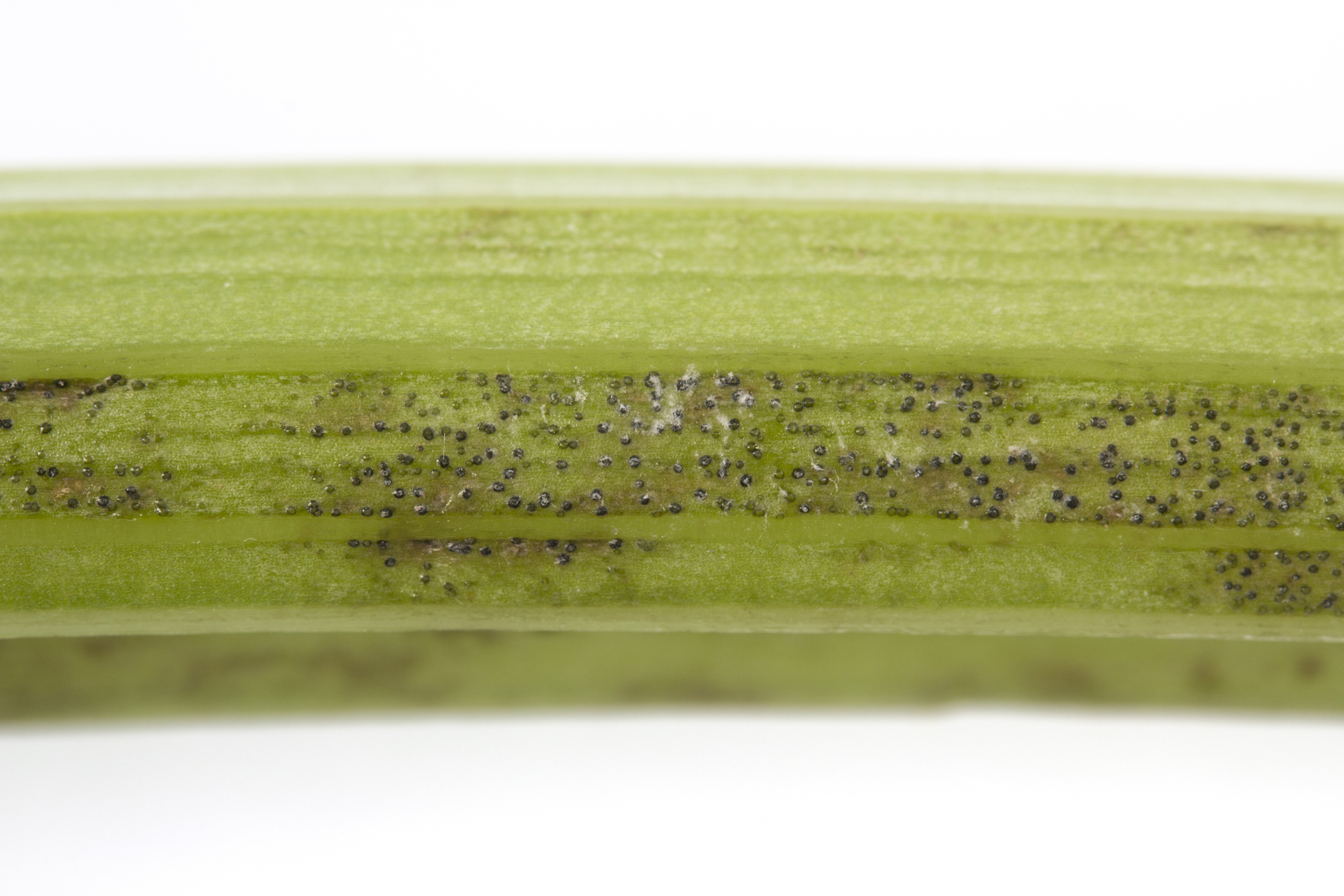 Pycnides de Septoria apiicola, responsable de la tache septorienne du céleri, regroupées sur le pétiole d'un céleri.