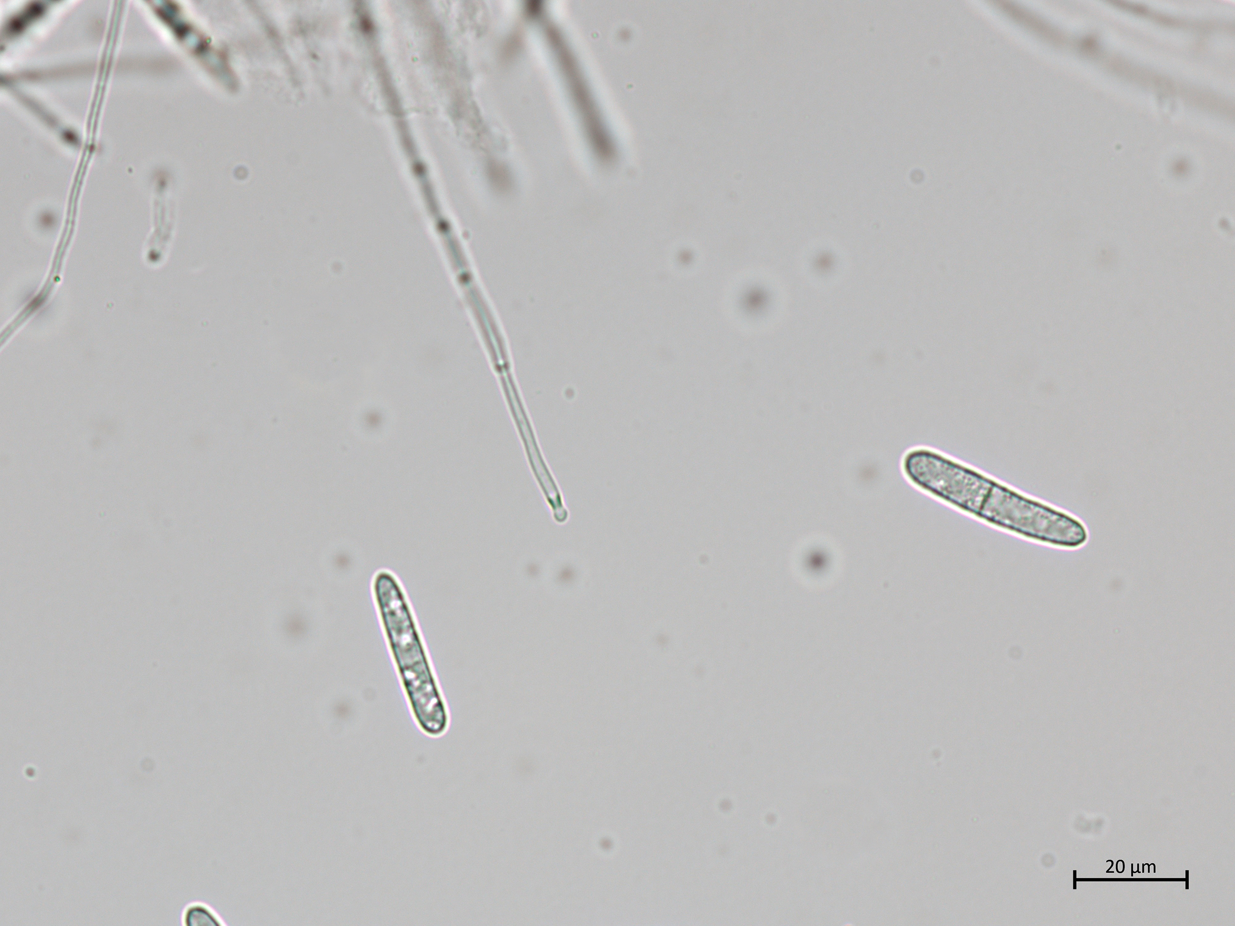 Deux conidies matures et une conidie en croissance à l'extrémité de son conidiophore.