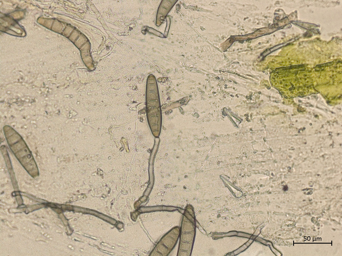 Conidies de Bipolaris sp. dont l'une attachée à son conidiophore.