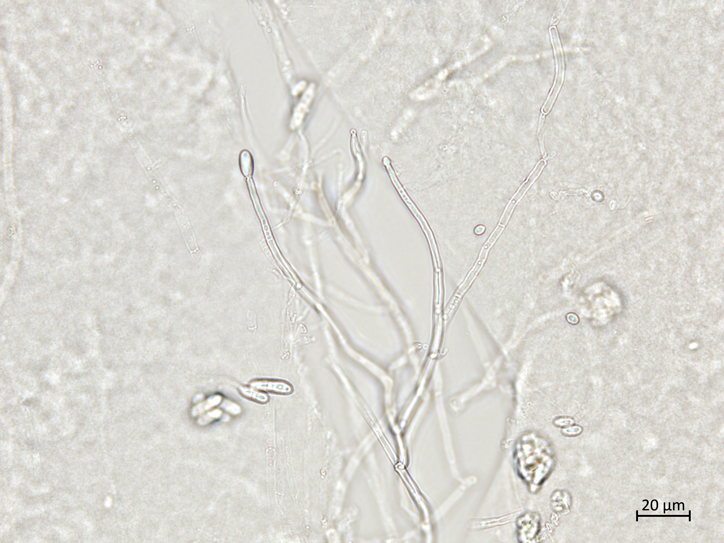 Conidies en croissance aux extrémités des conidiophores d'Ilyonectria liriodendri.