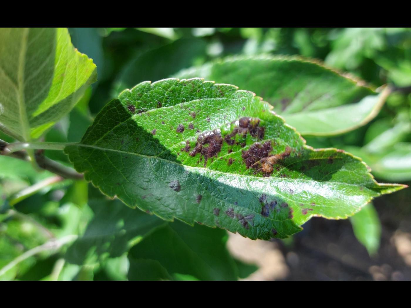 Description: Une feuille de pommier du cv Royal Gala montre des taches rougeâtres devenant brun foncé, réparties aléatoirement sur le limbe, de forme et de grosseur variables et présentes uniquement à la face adaxiale. Ces symptômes ne sont pas de nature phytopathologique mais plutôt liés à un facteur non parasitaire, soit une réaction phytotoxique aux produits de protection appliqués, en particulier le cuivre (sulfate de cuivre tribasique). Bien que ce produit soit homologué chez le pommier, celui-ci peut e… En savoir plus