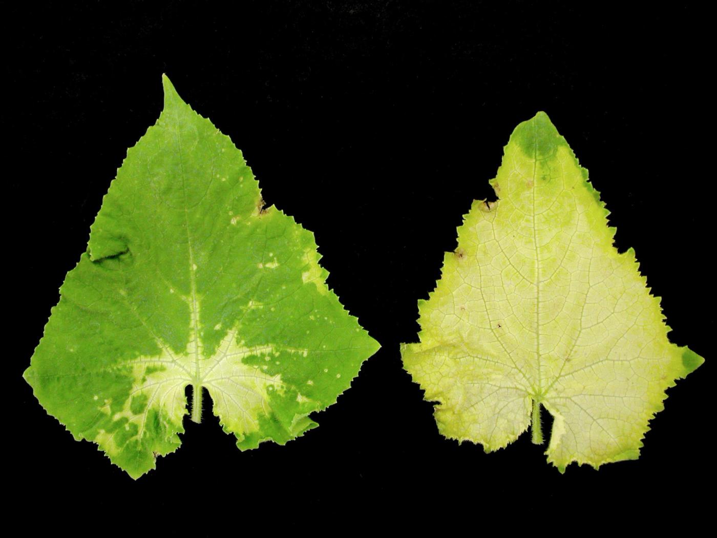 Feuille : les jeunes feuilles et les points de croissance présentent des anomalies de coloration (jaune ou blanc) et des malformations (limbe réduit, feuille effilée ou petite, enroulement). Les nervures demeurent vertes.