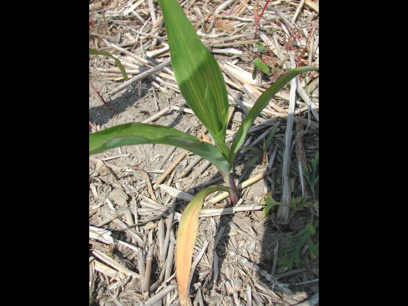 Description: Sur les feuilles d’un plant de maïs grain et fourrager non tolérant (variété non tolérante) au glyphosate, les feuilles basales montrent un jaunissement à rougissement important du limbe. Ce symptôme est apparu à la suite d’une dérive de l’herbicide glyphosate appliqué dans un champ de maïs voisin.