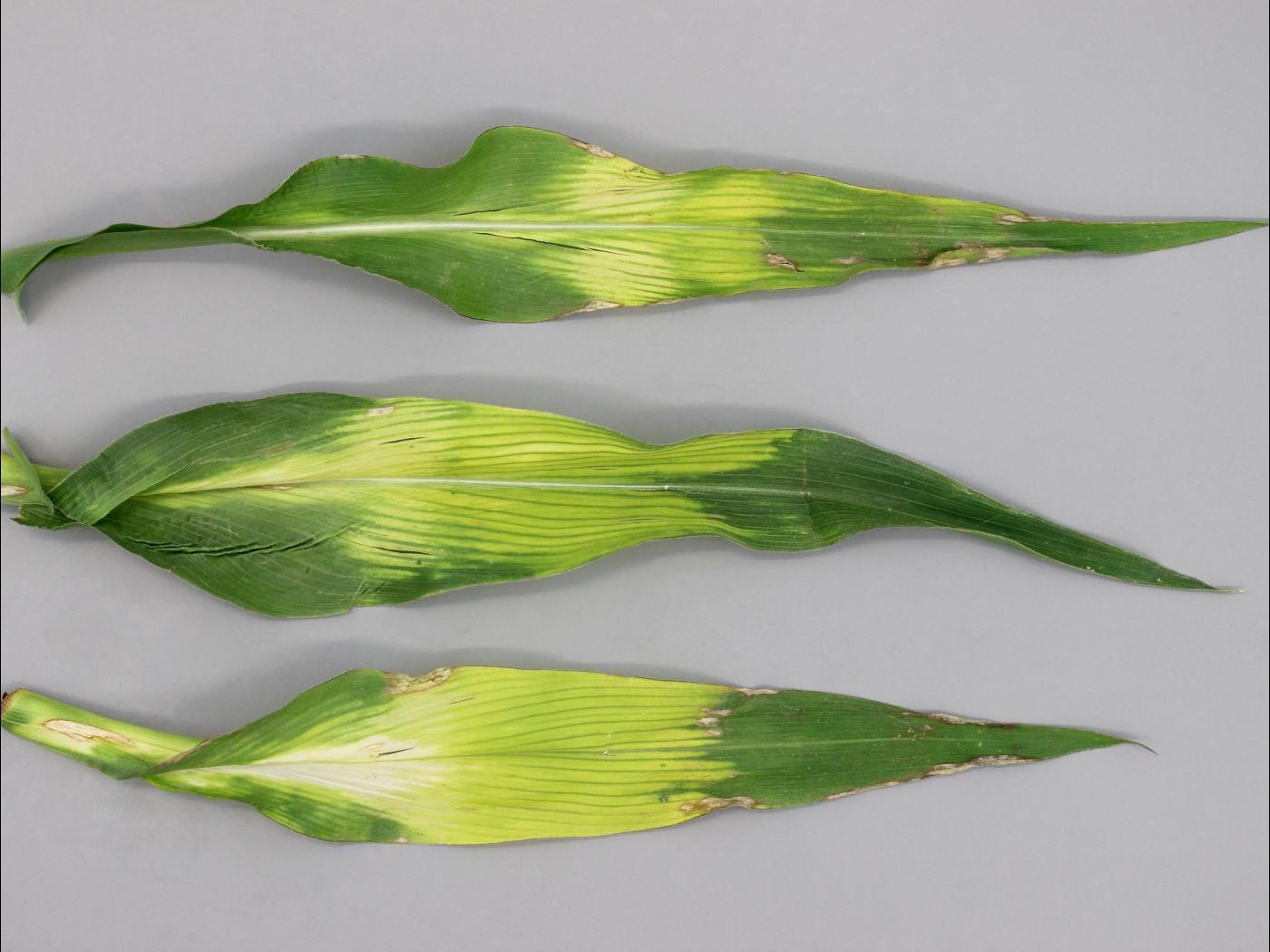 Légende: Feuilles de maïs avec blanchiment internervaire