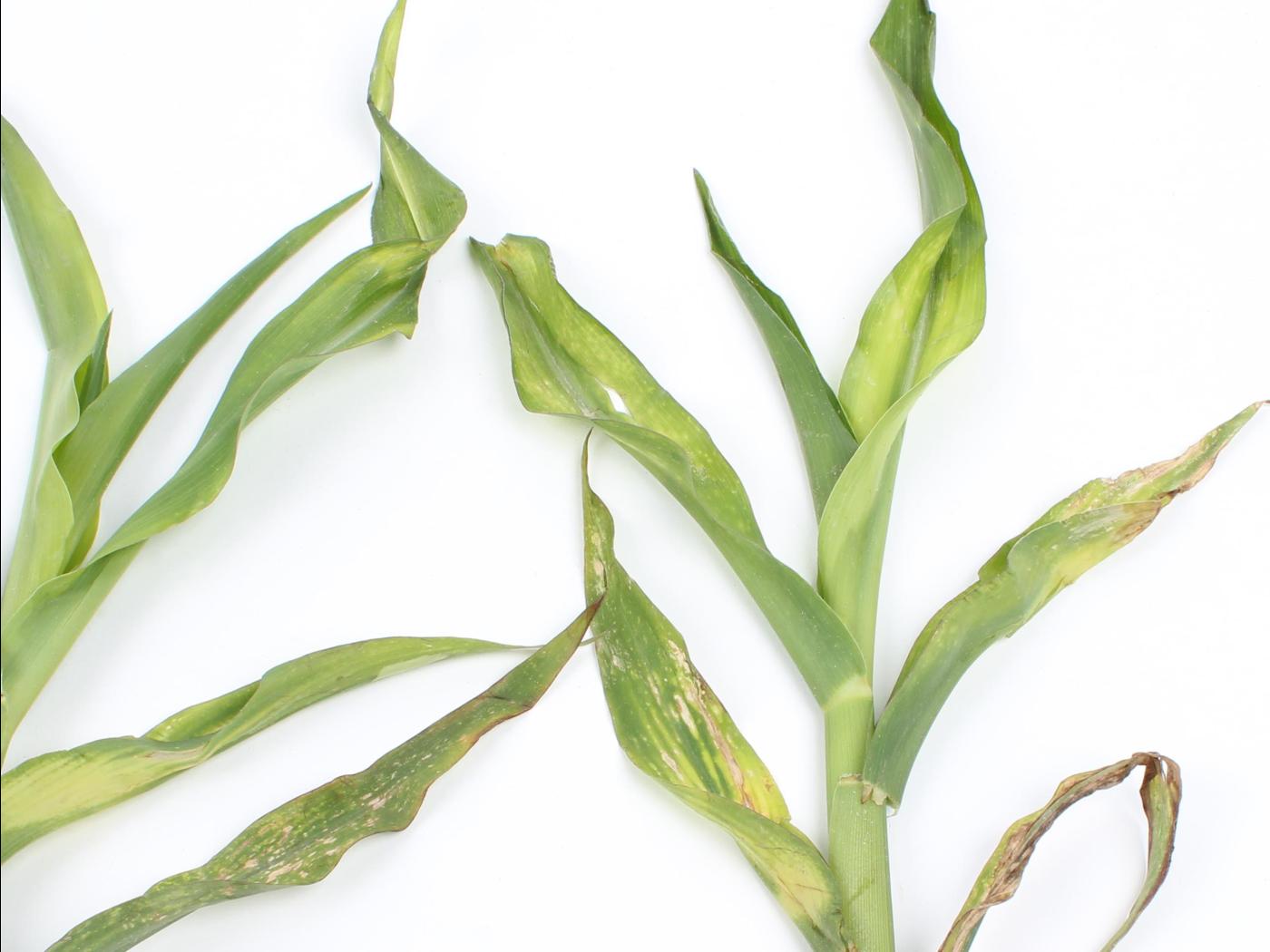 Légende: Feuilles de maïs avec blanchiment internervaire et brûlures