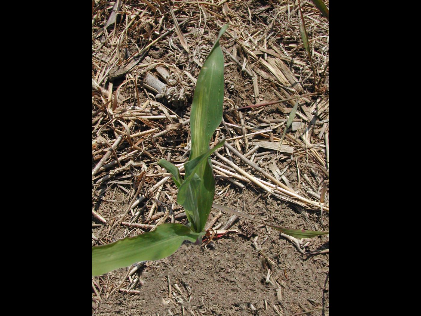 Description: Les feuilles terminale d’un plant de maïs grain tolérant (variété tolérante) au glyphosate montrent un jaunissement à blanchiment internervaire. La présence de cette bande blanchie (« banding pattern ») sur le limbe est caractéristique d’une phytotoxicité par le glyphosate. Sur le plant, des feuilles sont aussi brûlées à la marge et sur le limbe (non visible ici). Au champ, les plants affectés sont par ailleurs faiblement développés pour la période de l’année et sont flétris. Ces symptômes sont … En savoir plus