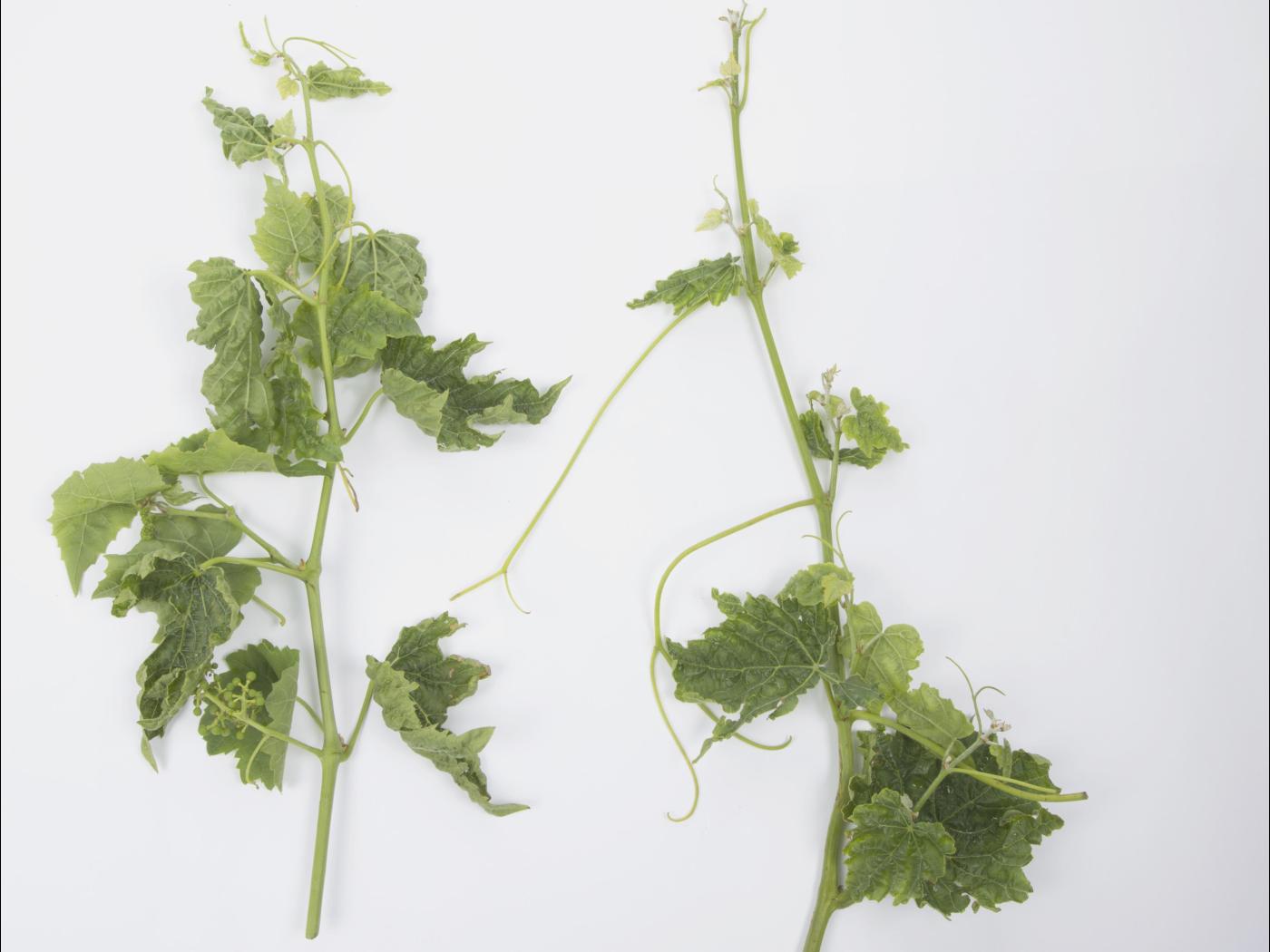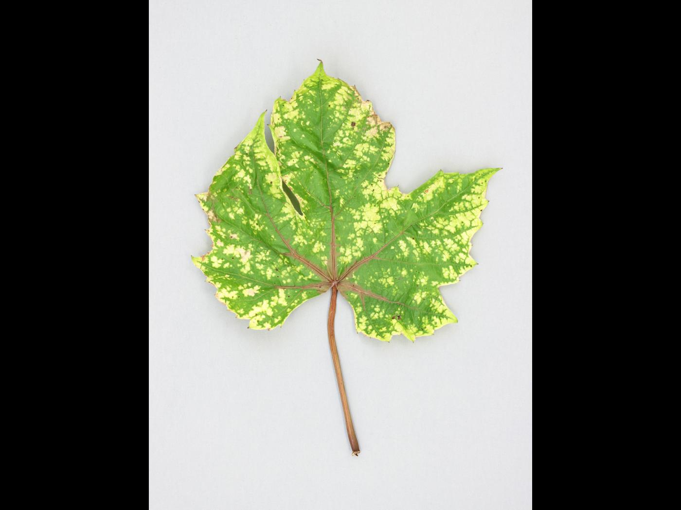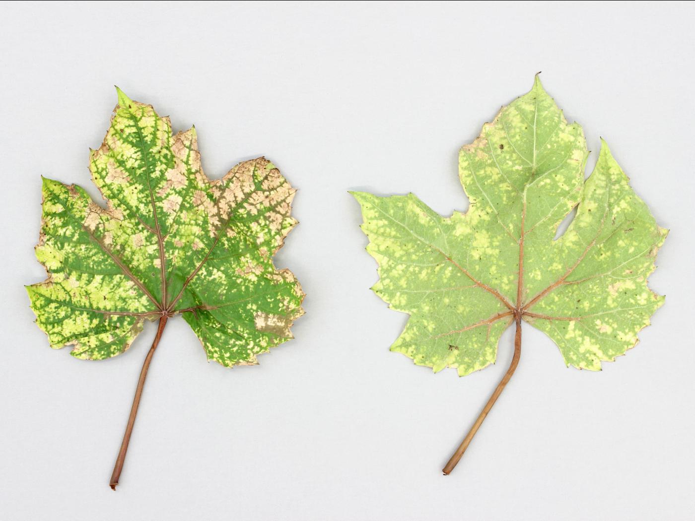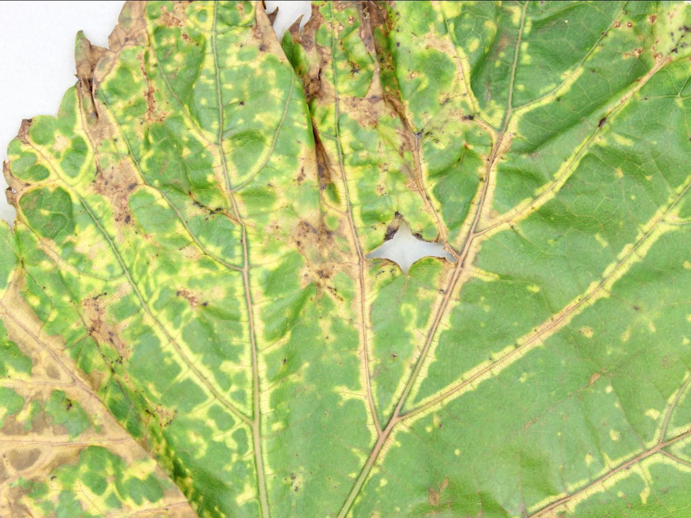 Feuille : les jeunes feuilles et les points de croissance présentent des anomalies de coloration jaunissement internervaire) et des malformations (feuilles recourbées vers le haut, feuilles au limbe réduit, effilée ou petite la deuxième année; enroulement). Les nervures demeurent vertes.