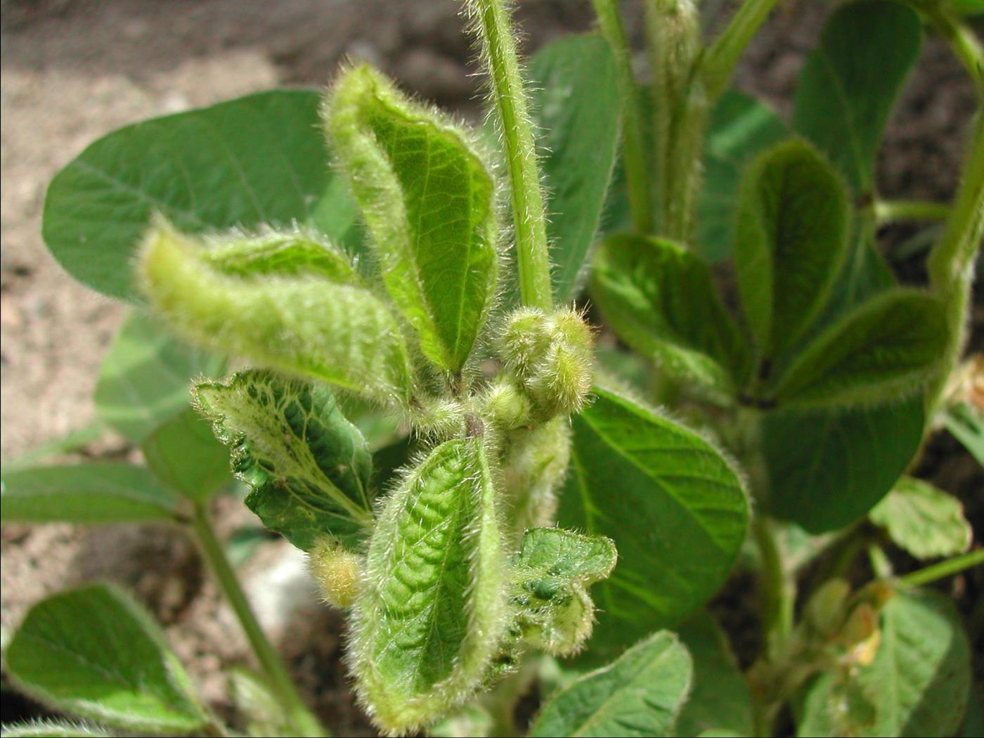Cas dicamba – Le dicamba est un herbicide, considéré comme un régulateur de croissance, utilisé pour lutter contre les mauvaises herbes à feuilles larges, annuelles, bisannuelles et vivaces. Le dicamba est homologué dans la culture du maïs, des céréales, des prairies, du bleuet nain mais pas dans le soya. Il peut être pulvérisé en prélevée ou en postlevée de la culture. Les herbicides régulateurs de croissance peuvent causer toute une variété d’anomalies de croissance chez les espèces sensibles, selon l’intensité d’exposition. Les symptômes de phytotoxicité se rapportant au dicamba sont des déformations (épinastie) de la tige et des pétioles, un renflement de la tige aux entre-noeuds et une élongation anormale de ceux-ci, et des feuilles en forme de cuillère. S'ensuit le jaunissement des points de croissance, le flétrissement et la nécrose des tissus. Parce que le dicamba est systémique, les symptômes qui lui sont attribuables apparaissent à la suite de la translocation du produit dans la plante, autant par le phloème que le par le xylème et particulièrement chez les plus jeunes feuilles, laquelle peut nécessiter d’un à trois jours. Les symptômes au champ présentent un gradient allant du plus au moins affecté, à mesure que l’on s'éloigne de la zone traitée. Le soya est extrêmement sensible au dicamba.