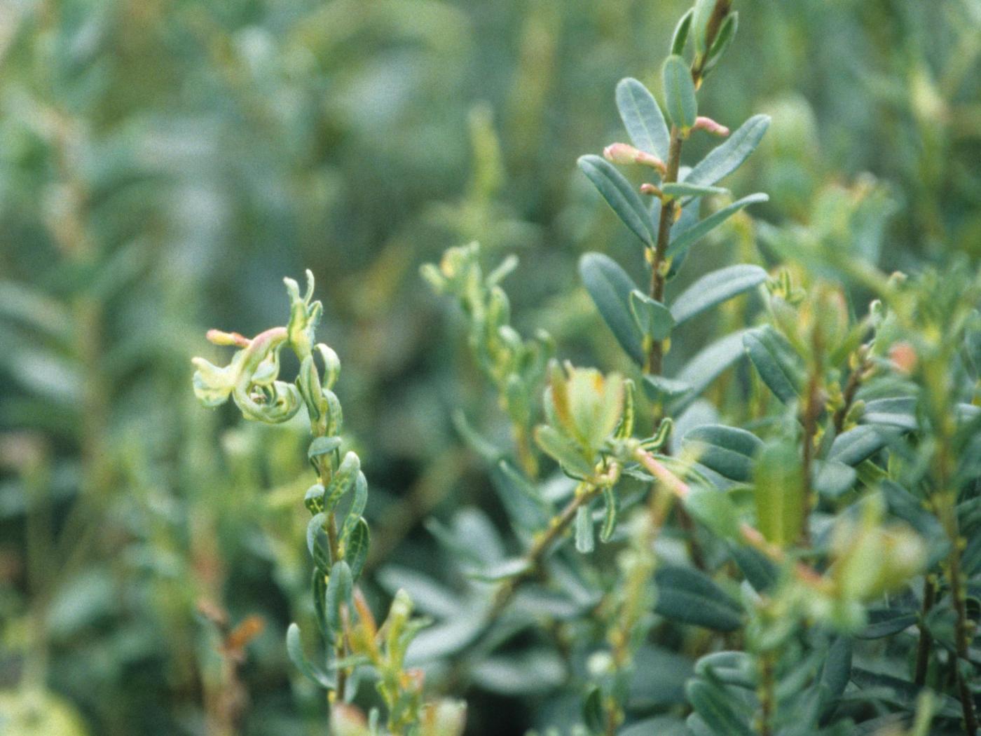 Feuille : déformation des jeunes feuilles. Le limbe est réduit, avec une marge enroulée vers le bas et vert foncé.