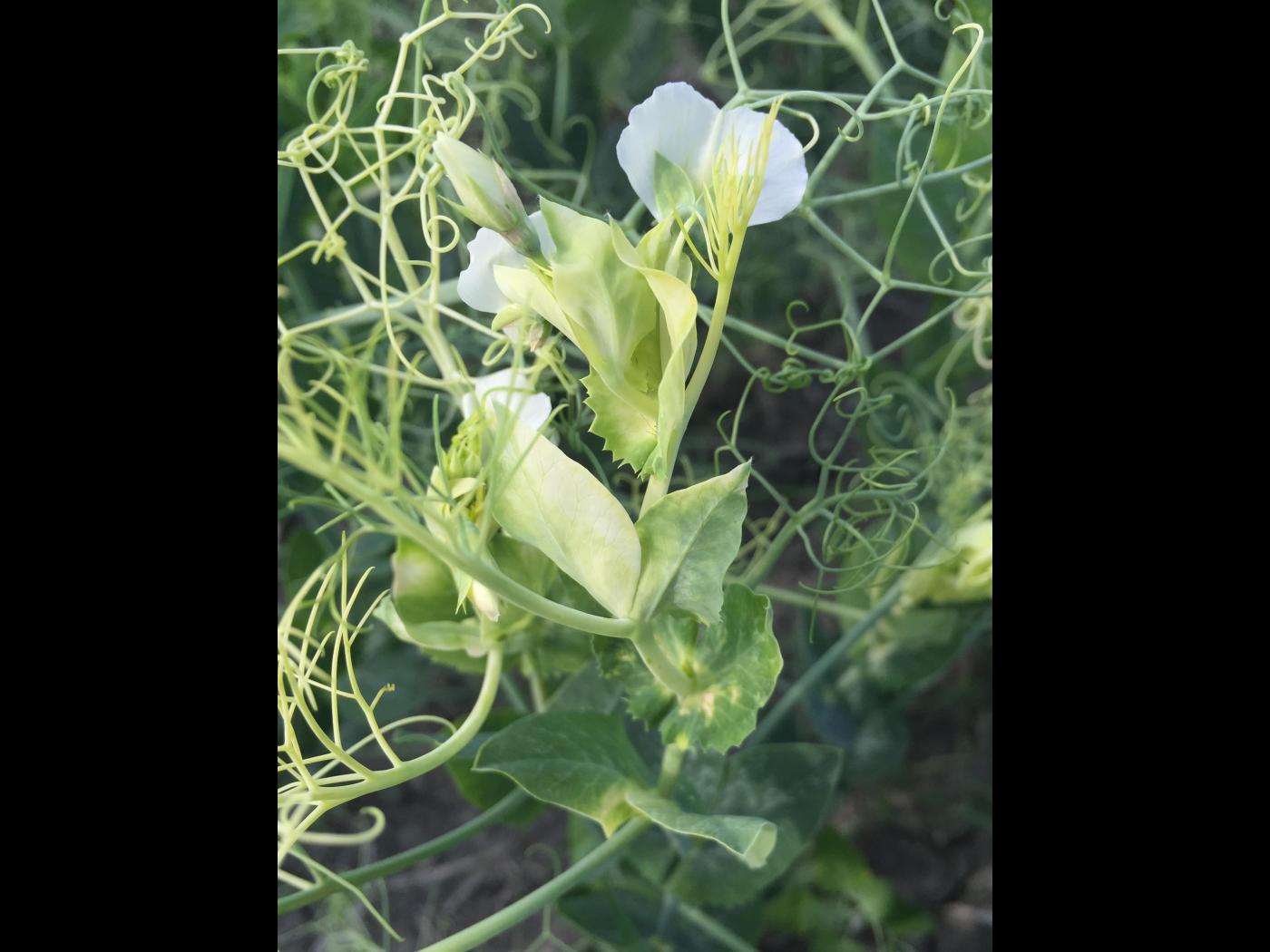 Légende: Jaunissement à blanchiment des feuilles terminales et vrilles du pois