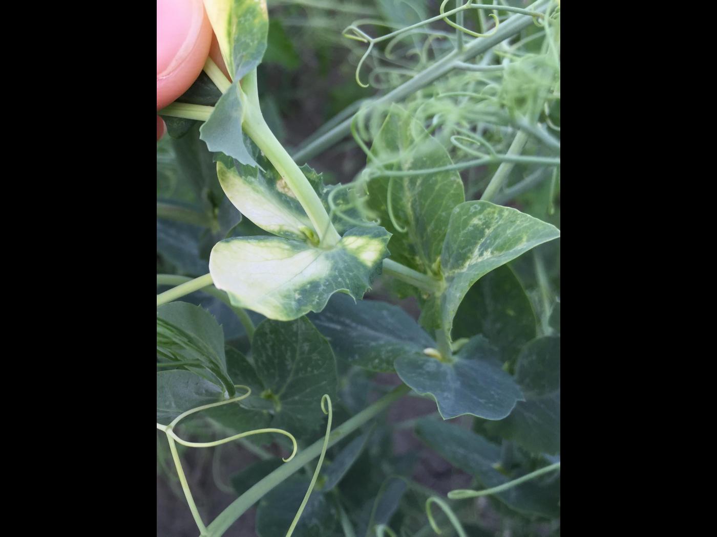 Légende: Jaunissement à blanchiment des feuilles terminales du pois