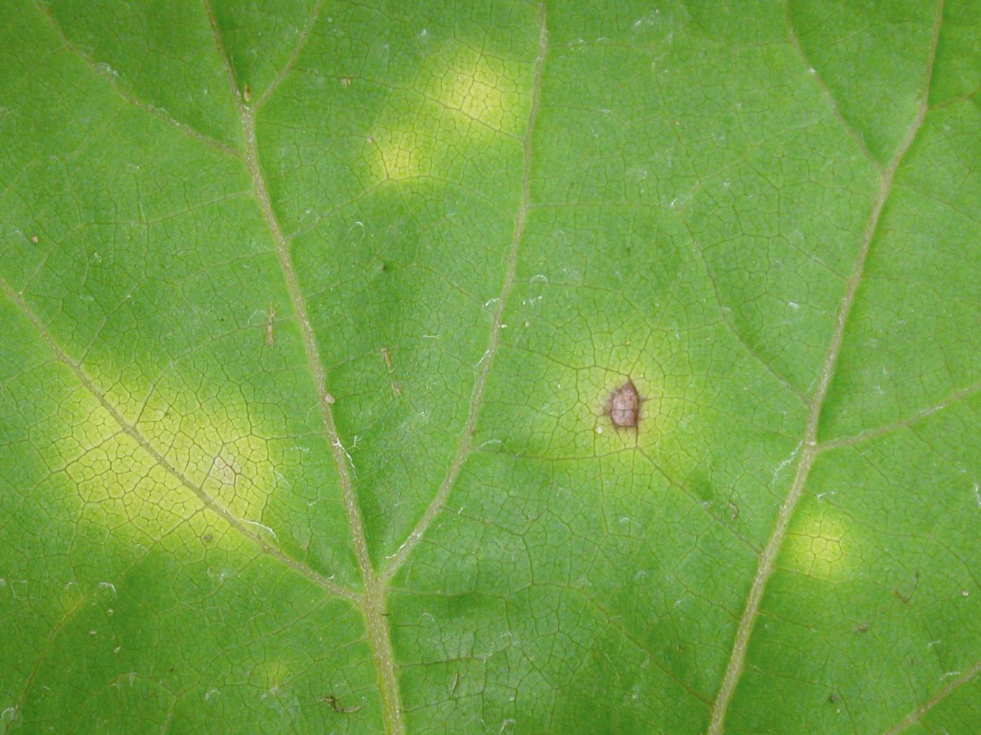 Feuille : présence de taches ou de brûlures brunes et circulaires des tissus touchés seulement. La perte de chlorophylle, pouvant aller jusqu’au blanchiment, et la nécrose des tissus affectés sont caractéristiques.