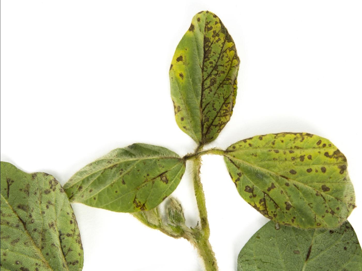 Légende: Feuilles de soya avec brûlures et nervation pourpre
