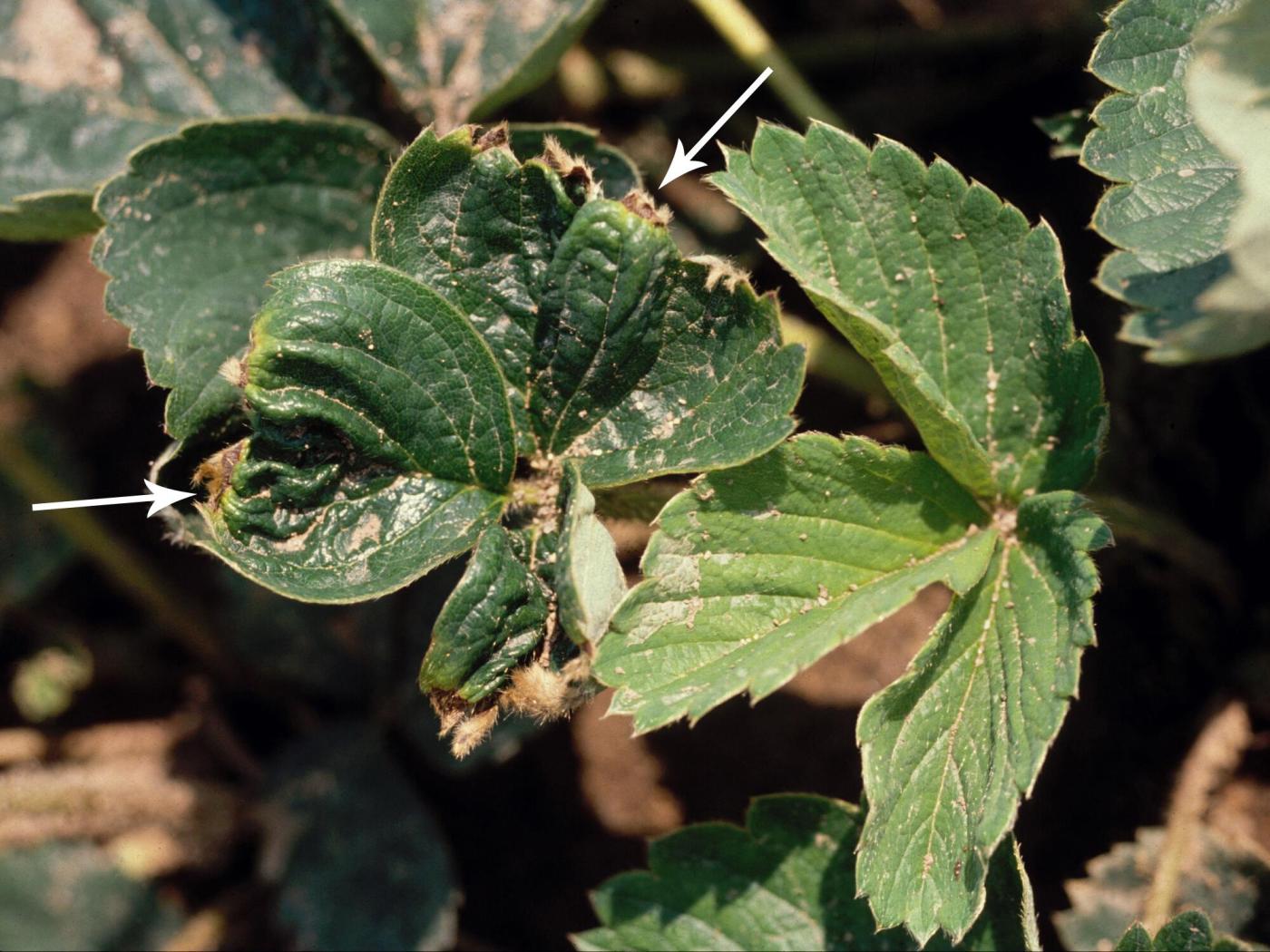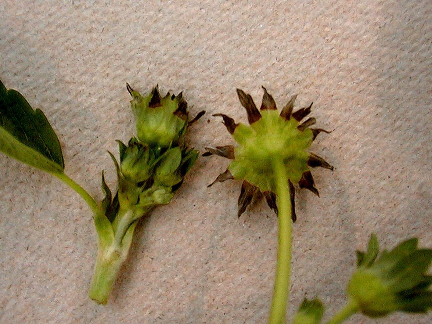 Fruit : les dommages apparaissent à l’apex. Ils se caractérisent par une lésion affaissée brune ou noire. Les akènes se développent densément en plaques ou sur la totalité du fruit. Les fruits sont mous.