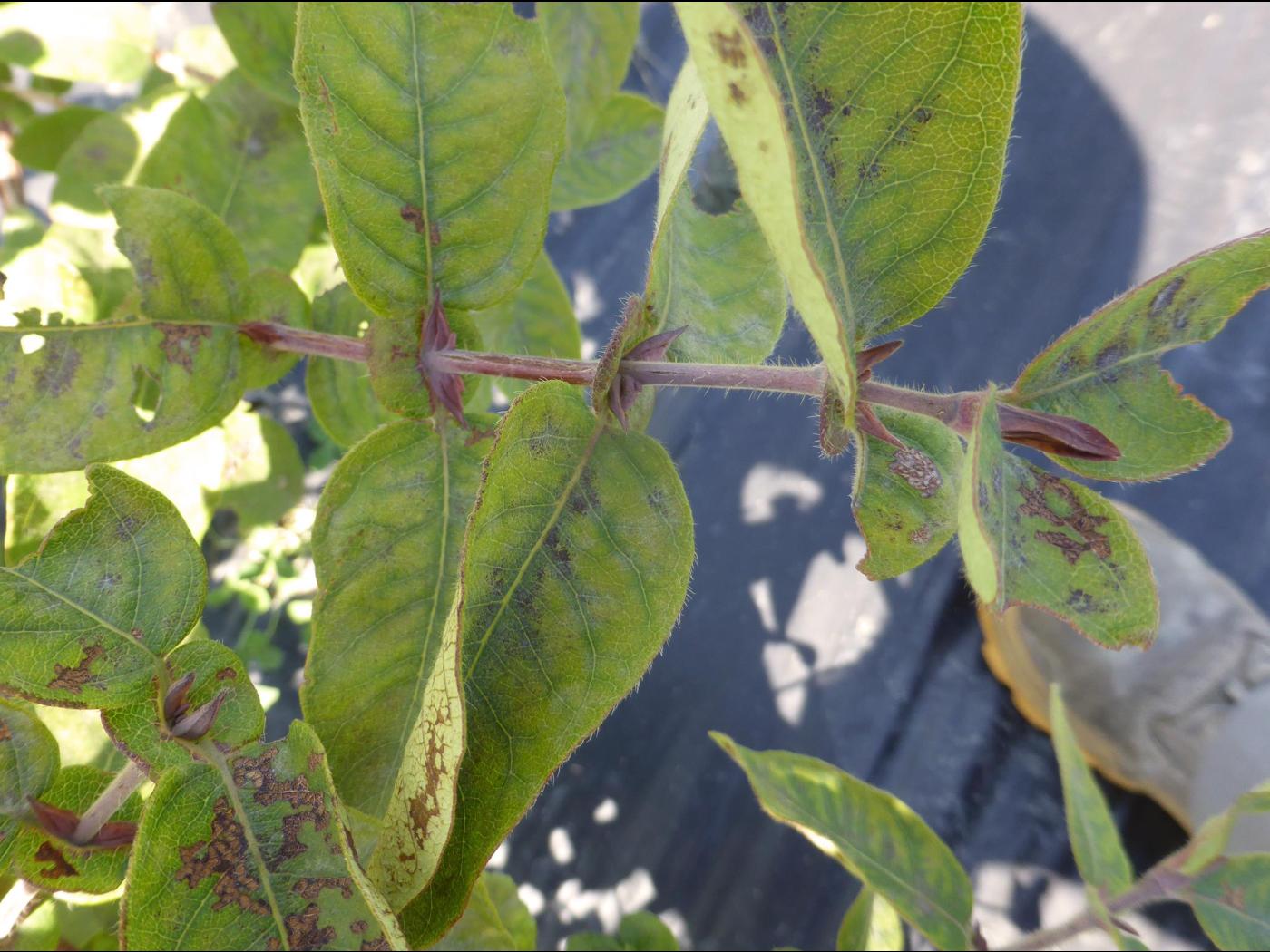 Description: Début du jaunissement internervaire sur les feuilles supérieures du camérisier, conséquence d'une carence en manganèse.