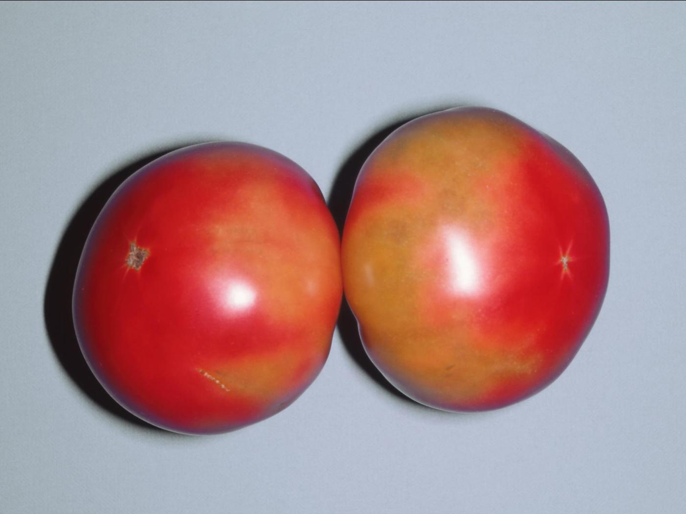 Fruit : le symptôme caractéristique sur les fruits est un mûrissement inégal qui se manifeste par des anomalies de coloration de type marbrure. Les fruits sont mous, ont un goût fade, montrent une coloration inégale des tissus, un brunissement du système vasculaire et des loges asymétriques. La production de fruits est réduite et les fruits sont d’un plus petit calibre.