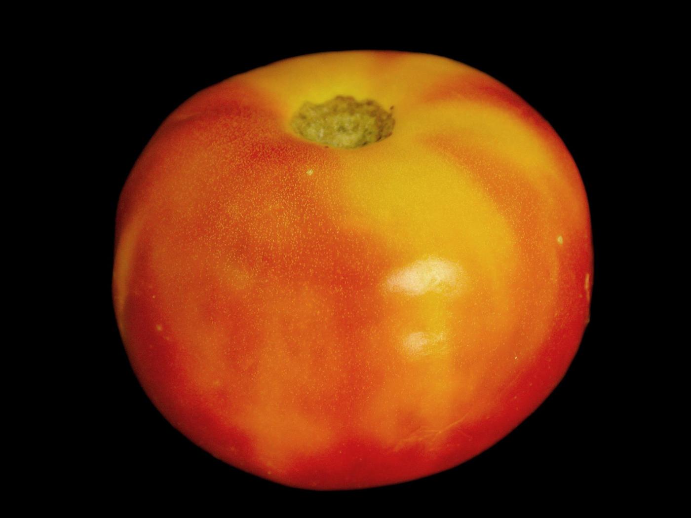 Fruit : sur les fruits verts, verdissement sombre de l’épiderme à l’épaule de la tomate. L’anomalie de coloration est uniforme ou sous la forme de taches irrégulières. Sur les fruits mûrs, la zone affectée demeure verte (collet vert) ou devient progressivement jaune (collet jaune). Le péricarpe des zones atteintes est plus dur que celui des fruits mûrs.