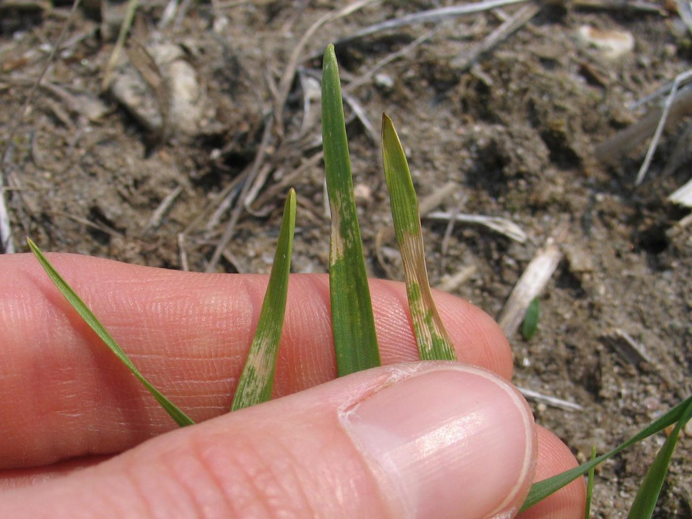 Chez les céréales, ces symptômes sont observés sous les conditions suivantes : nuits claires, humidité relative basse, absence de vent et température nocturne entre 5 et 10 °C. Sous ces conditions, il y a une perte rapide de chaleur à partir de la surface du sol vers l'atmosphère, ce qui permet au froid d'atteindre les plantes. Cet effet est combiné aux matinées ensoleillées avec de la rosée. Les dommages sont surtout observés sur les surfaces foliaires exposées vers le haut et chez le blé, les symptômes apparaissent sur le limbe des feuilles principalement à leur point de flexion. Ce problème non parasitaire est occasionnel et mineur.