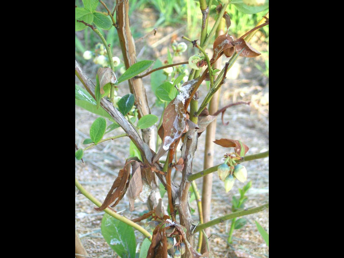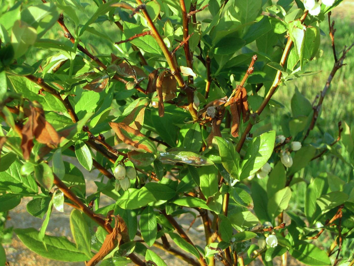 Dans les bleuetières, les engrais sont généralement appliqués au sol. Parfois des engrais foliaires sont employés pour corriger un problème précis. Les applications foliaires sont généralement sans conséquence lorsque réalisées selon la recommandation. Par contre, lorsque le volume d’eau utilisé est trop faible, des brûlures apparaissent rapidement sur le feuillage, car l’engrais est trop concentré. Les excès de fertilisation ou d’engrais foliaires sont occasionnels et mineurs, mais il faut demeurer vigilant face à la gravité des brûlures. Généralement les symptômes sont visibles à différents endroits dans le champ, voire dans tout le champ.