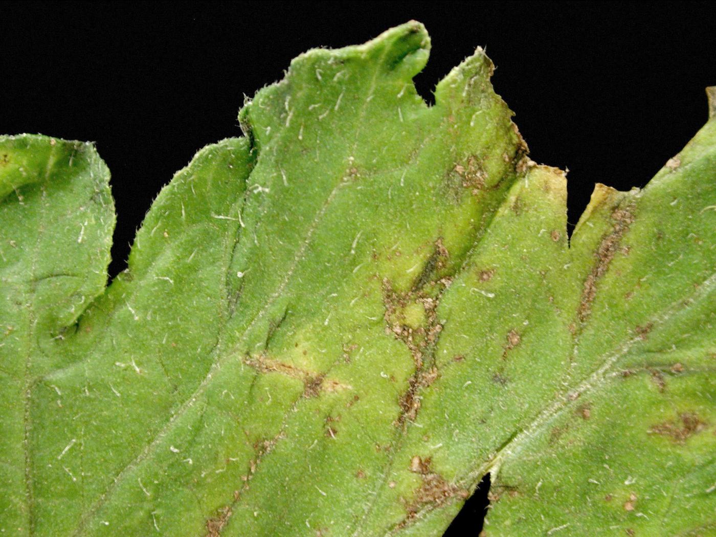 Description: Une vue rapprochée d’une foliole de tomate de serre (cv 'Trust') montre des taches brunes irrégulières pouvant être localisées sur et entre les nervures. Les tests de laboratoire se sont avérés négatifs pour la détection de champignons et de bactéries, mais la présence de particules cristallines au centre des taches a été remarquée lors de l'examen microscopique. Les plants affectés sont localisés sous les arches en acier galvanisé (acier et zinc) de la structure de la serre. L’humidité relative… En savoir plus