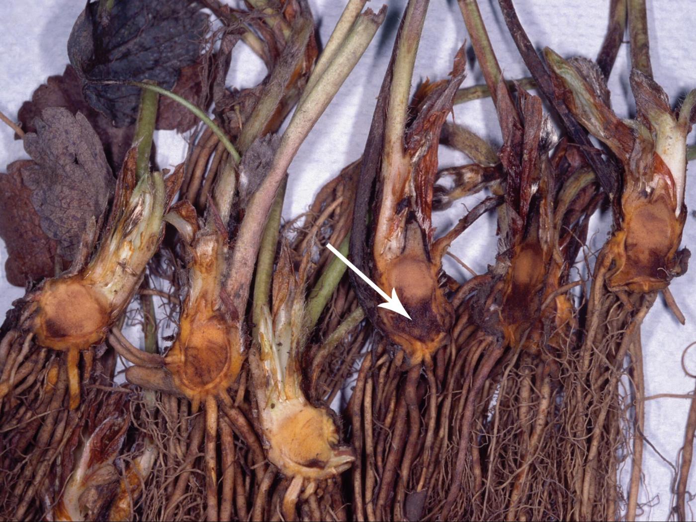 Le gel en entrepôt peut être confondu avec des dommages de stèle rouge (Phytophthora fragariae – aucun brunissement du collet, mais plutôt une stèle rouge des racines), le pourridié phytophthoréen (Phytophthora cactorum – racines abondantes, généralement brunissement dans la partie supérieure du collet), la pourriture noire des racines (complexe fongique – racines noires, collet sans symptôme) et le flétrissement verticillien (Verticillium spp. – flétrissement et dépérissement des vieilles feuilles, collet généralement sain, mais parfois brunissement du système vasculaire).